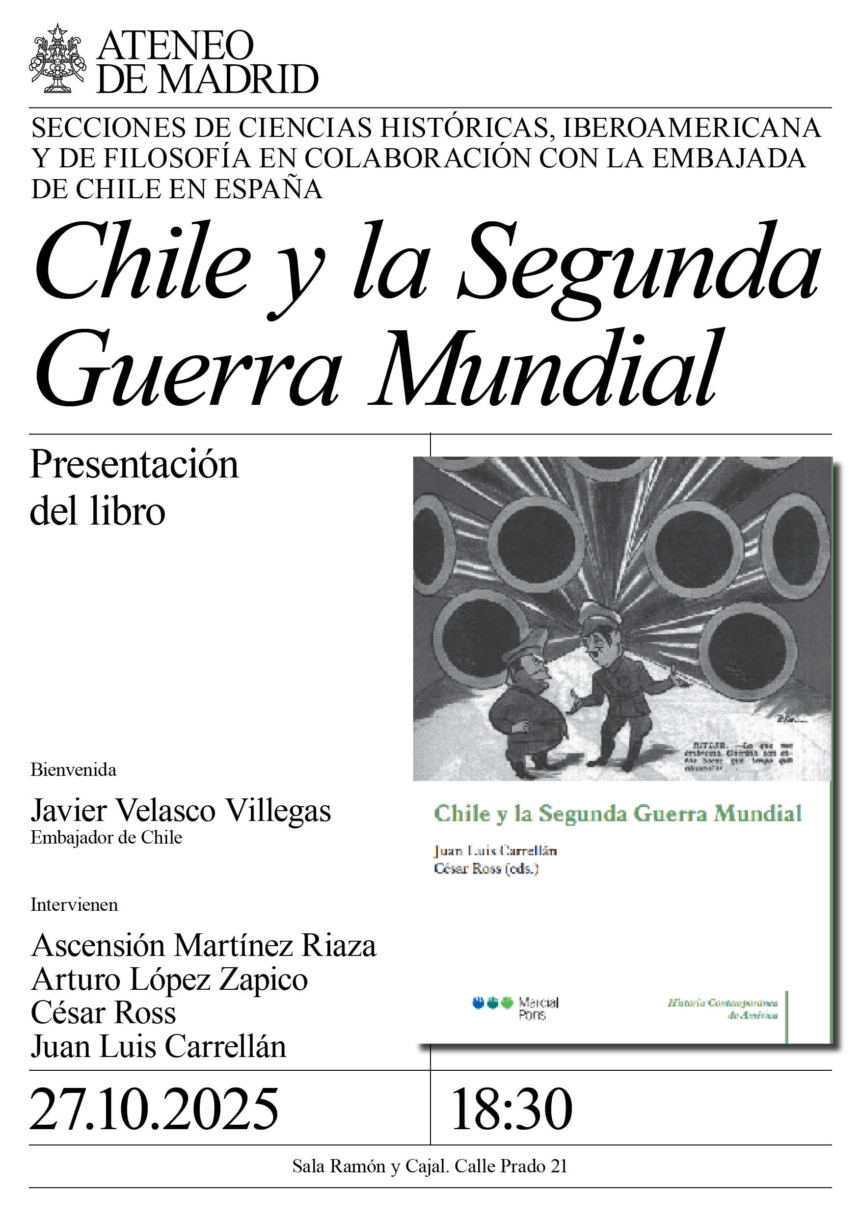 Secciones de Ciencias Históricas, Iberoamericana y de Filosofía en colaboración con la embajada de Chile en España. Bienvenida: Javier Velasco Villegas, embajador de Chile. Intervienen: Ascensión Martínez Riaza, catedrática emérita de la Universidad Complutense de Madrid; Arturo López Zapico, profesor de la Universidad Autónoma de Madrid; César Ross, profesor de la Universidad de Santiago de Chile y premio nacional de Historia 2024; y