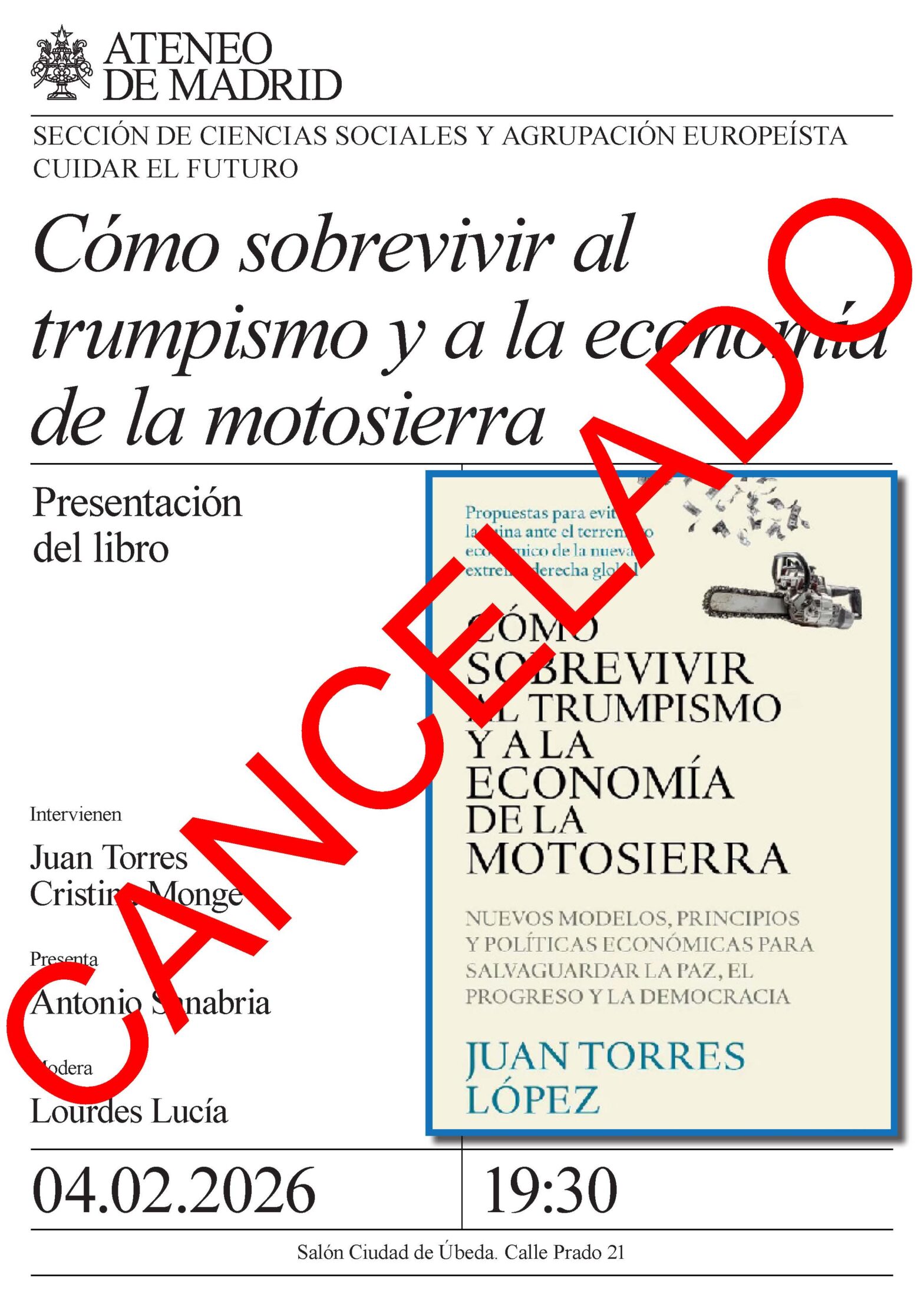Sección de Ciencias Sociales y Agrupación Europeísta Cuidar el futuro. Intervienen: Juan Torres, autor y Cristina Monge. Presenta: Antonio Sanabria. Modera: Lourdes Lucía. Salón Ciudad de Úbeda. 19:30h.
