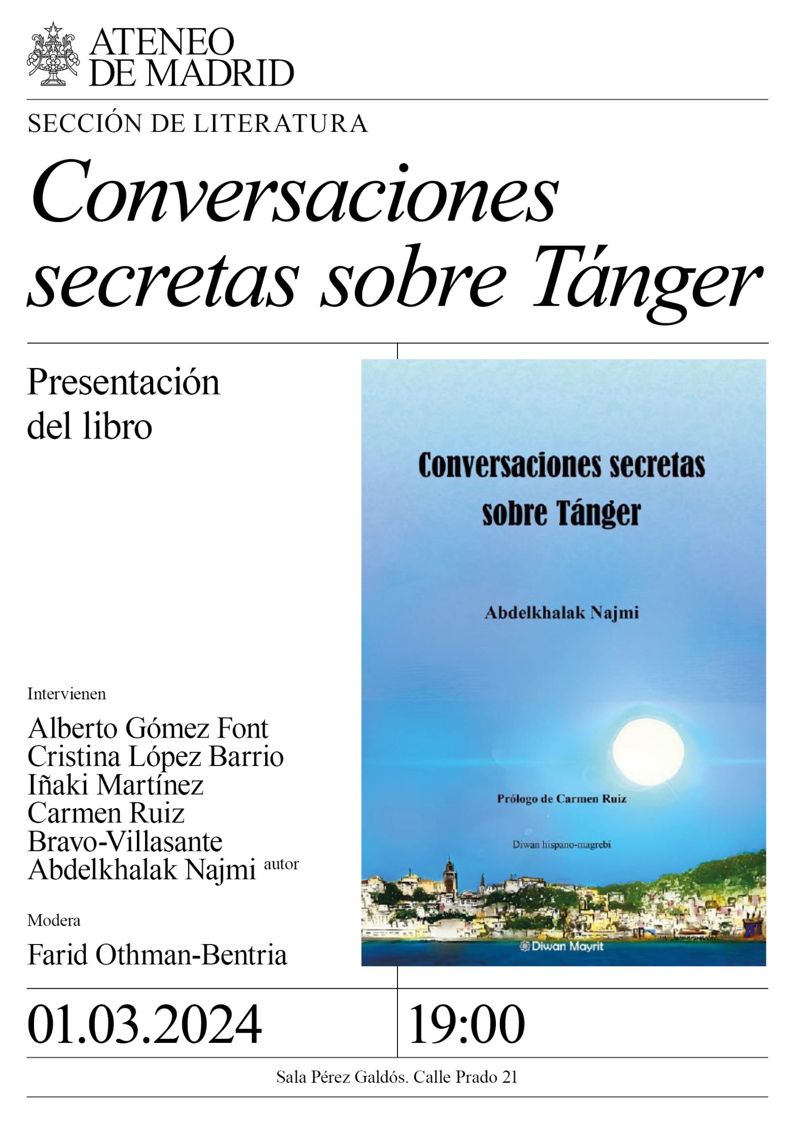 Sección de Literatura. Intervienen: Alberto Gómez Font, lingüista y barman. Cristina López Barrio, escritora y abogada. Iñaki Martínez, escritor y abogado. Carmen Ruiz Bravo-Villasante, arabista y autora del prólogo. Abdelkhalak Najmi, escritor y traductor. Modera: Farid Othman-Bentria, gestor cultural. Sala Pérez Galdós. 19:00h.