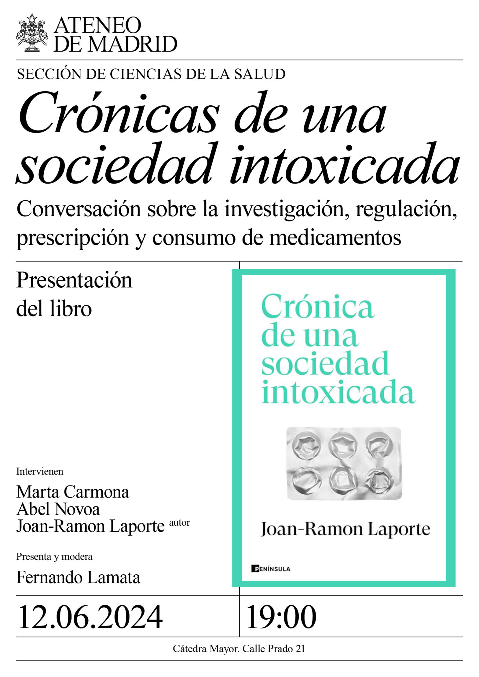 Sección de Ciencias de la Salud. Intervienen: Marta Carmona, psiquiatra y portavoz de sanidad de MM, la Asamblea de Madrid. Abel Novoa, médico de familia y Joan-Ramon Laporte, farmacólogo clínico, autor. Presenta y modera: Fernando Lamata. Cátedra Mayor. 19:00h.