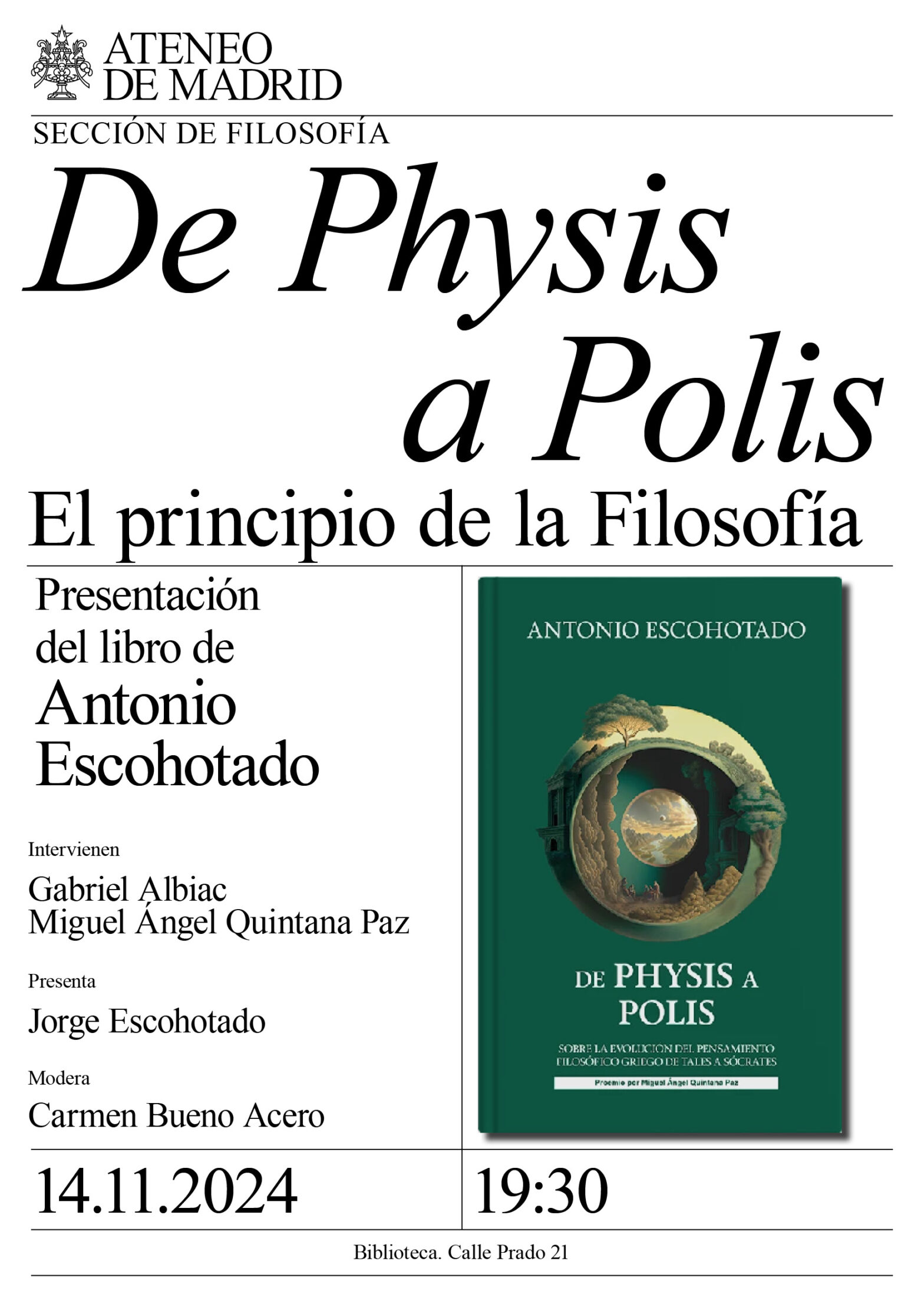 Sección de Filosofía. Intervienen: Gabriel Albiac, filósofo, escritor y colaborador español de medios de comunicación y Miguel Ángel Quintana Paz, doctor en Filosofía, profesor y director académico en el Instituto Superior de Sociología, Economía y Política. Presenta: Jorge Escohotado, tercer hijo del filósofo, dirige La Emboscadura (www.laemboscadura.com), editorial que permite la distribución global de la obra de Escohotado mediante formatos impresos y digitales. Modera: Carmen Bueno Acero. Biblioteca.19:30h.