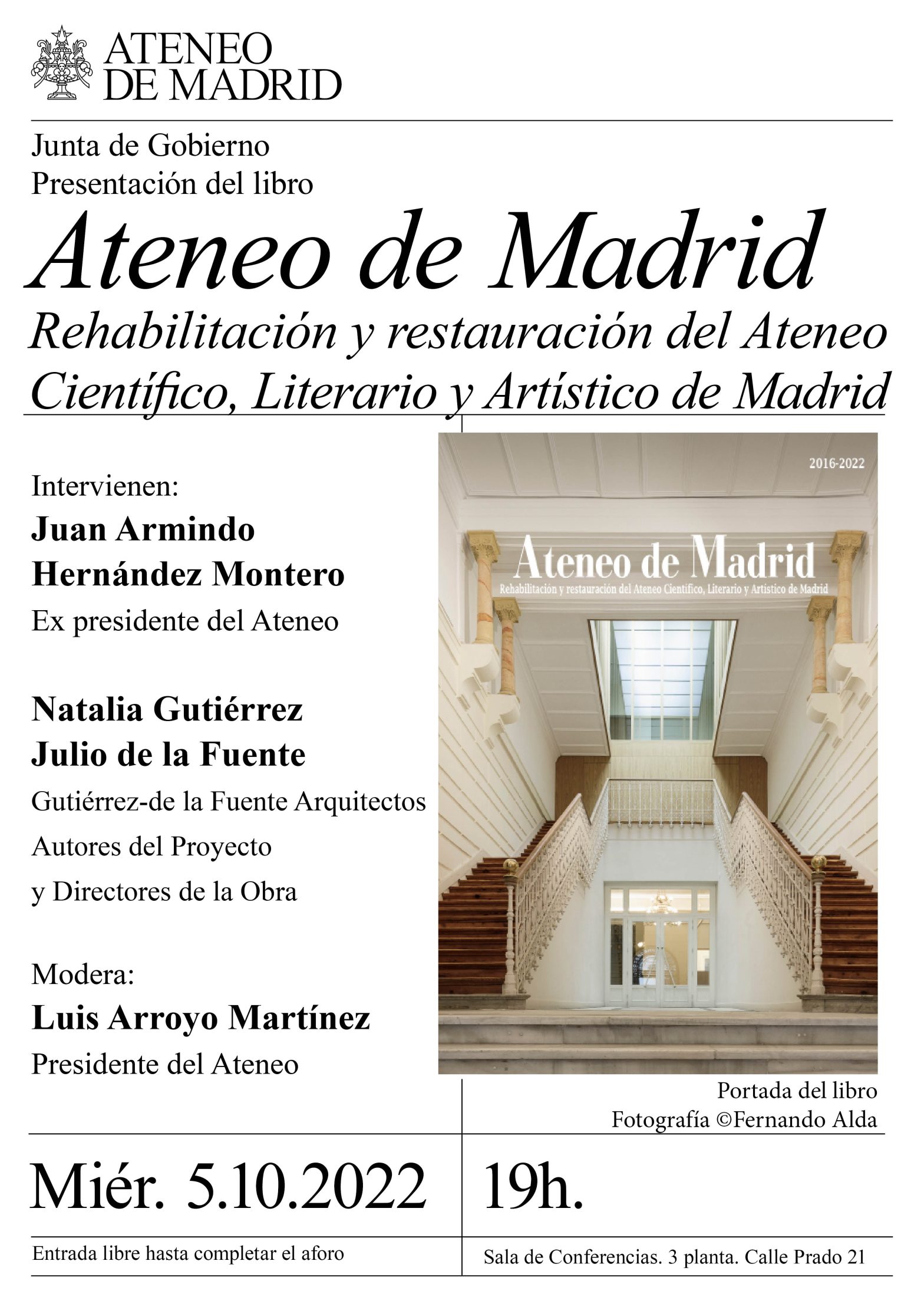 Junta de Gobierno. Interviene: Juan Armindo Hernández Montero, exp residente del Ateneo de Madrid; Natalia Gutiérrez y Julio de la Fuente, Gutiérrez-de la Fuente Arquitectos, autores del Proyecto y directores de la Obra. Modera: Luis Arroyo Martínez, presidente del Ateneo de Madrid. Sala de Conferencias. Portada del libro. Fotografía © Fernando Alda