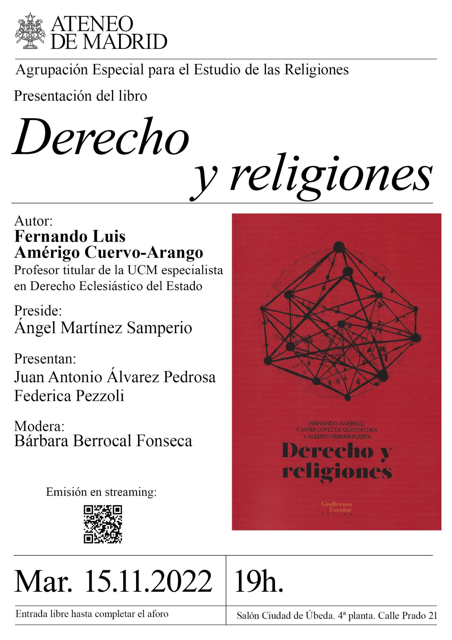 Agrupación Especial para el Estudio de las Religiones. Autor Fernando Luis Amérigo Cuervo-Arango, profesor titular de la UCM especialista en Derecho Eclesiástico del Estado. Preside Ángel Martínez Samperio. Presentan: Juan Antonio Álvarez Pedrosa y Federica Pezzoli. Modera Bárbara Berrocal Fonseca. Salón Ciudad de Úbeda. 19 h. Enlace para emisión en streaming: https://meet.google.com/rwt-ogar-nav