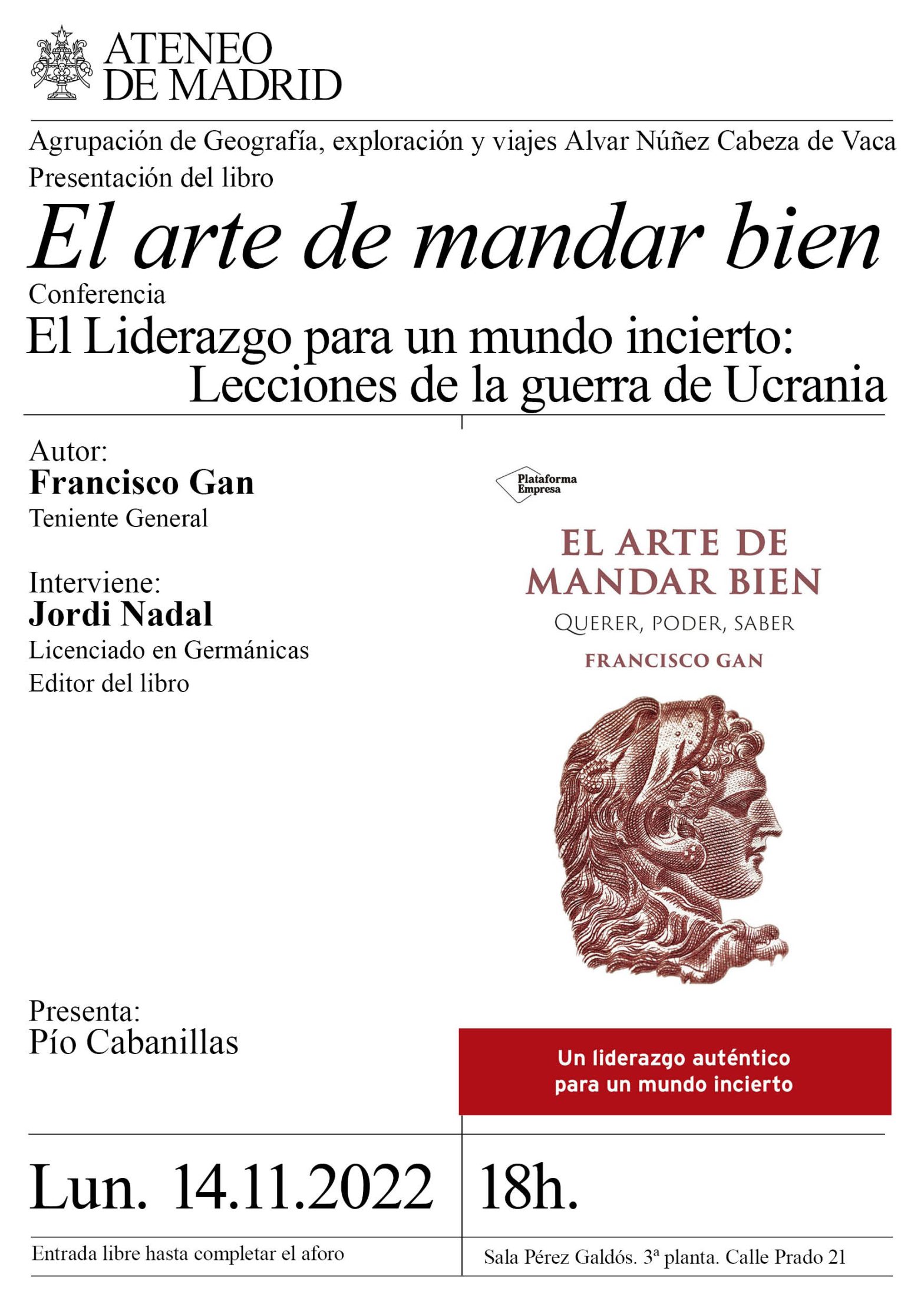 Agrupación Especial de Geografía, exploración y viajes Alvar Núñez Cabeza de Vaca. Presentación del libro El Arte de Mandar Bien. Conferencia: El Liderazgo para un mundo incierto: Lecciones de la guerra de Ucrania. Autor: Francisco Gan, teniente general. Intervienen: Jordi Nadal, licenciado en Germánicas, editor del libro. Presenta Pío Cabanillas. Sala Pérez Galdós. 18 h