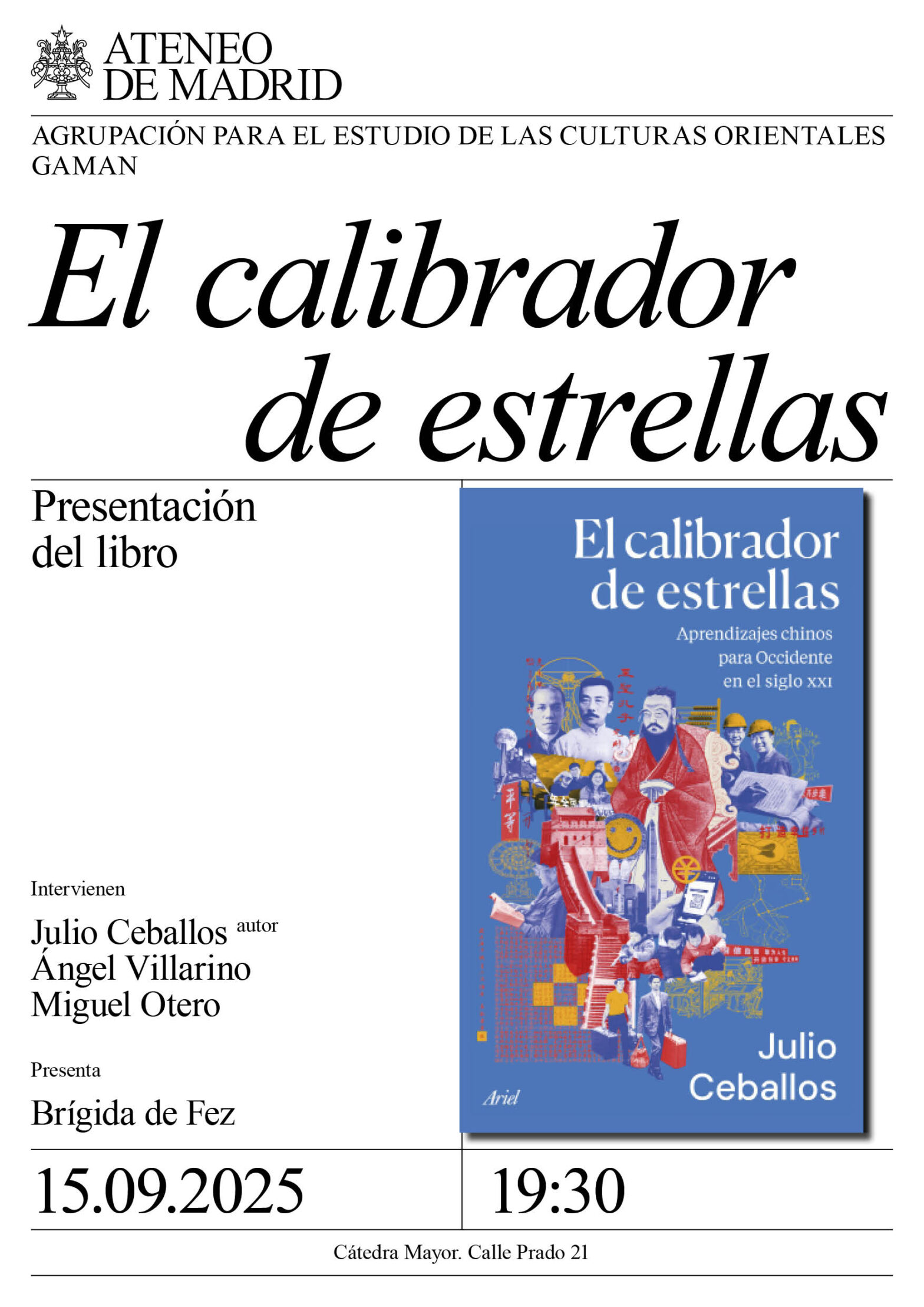 Agrupación para el estudio de las culturas orientales Gaman. Con: Julio Ceballos, autor, consultor de negocio especializado en internacionalización, estrategia de negocio y desarrollo de mercado; Ángel Villarino, periodista experto en asuntos internacionales y geopolitica asiática; y Miguel Otero Iglesias, investigador principal en el Real Instituto Elcano y profesor en IE School of Global and Public Affairs. Presenta: Brígida de Fez. Cátedra Mayor. 19:30h.