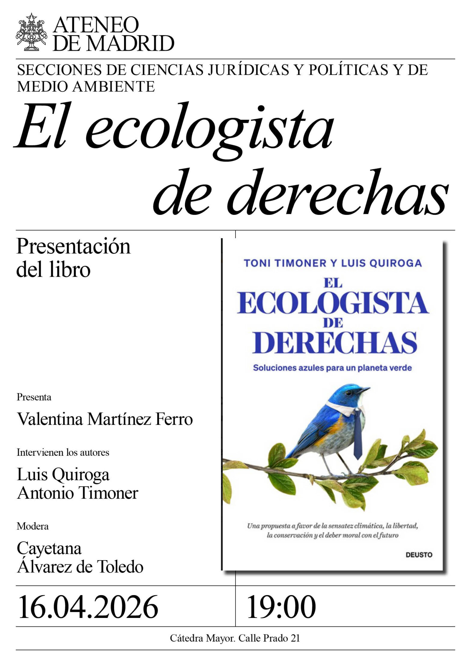 Secciones de Ciencias Jurídicas y Políticas y de Medio Ambiente. Presenta: Valentina Martínez Ferro. Intervienen los autores: Luis Quiroga, cofundador y presidente del think tank ambientalista OIKOS y Antonio Timoner, cofundador y vicepresidente del think tank ambientalista OIKOS. Modera: Cayetana Álvarez de Toledo, historiadora y diputada nacional. Cátedra Mayor. 19:00h.