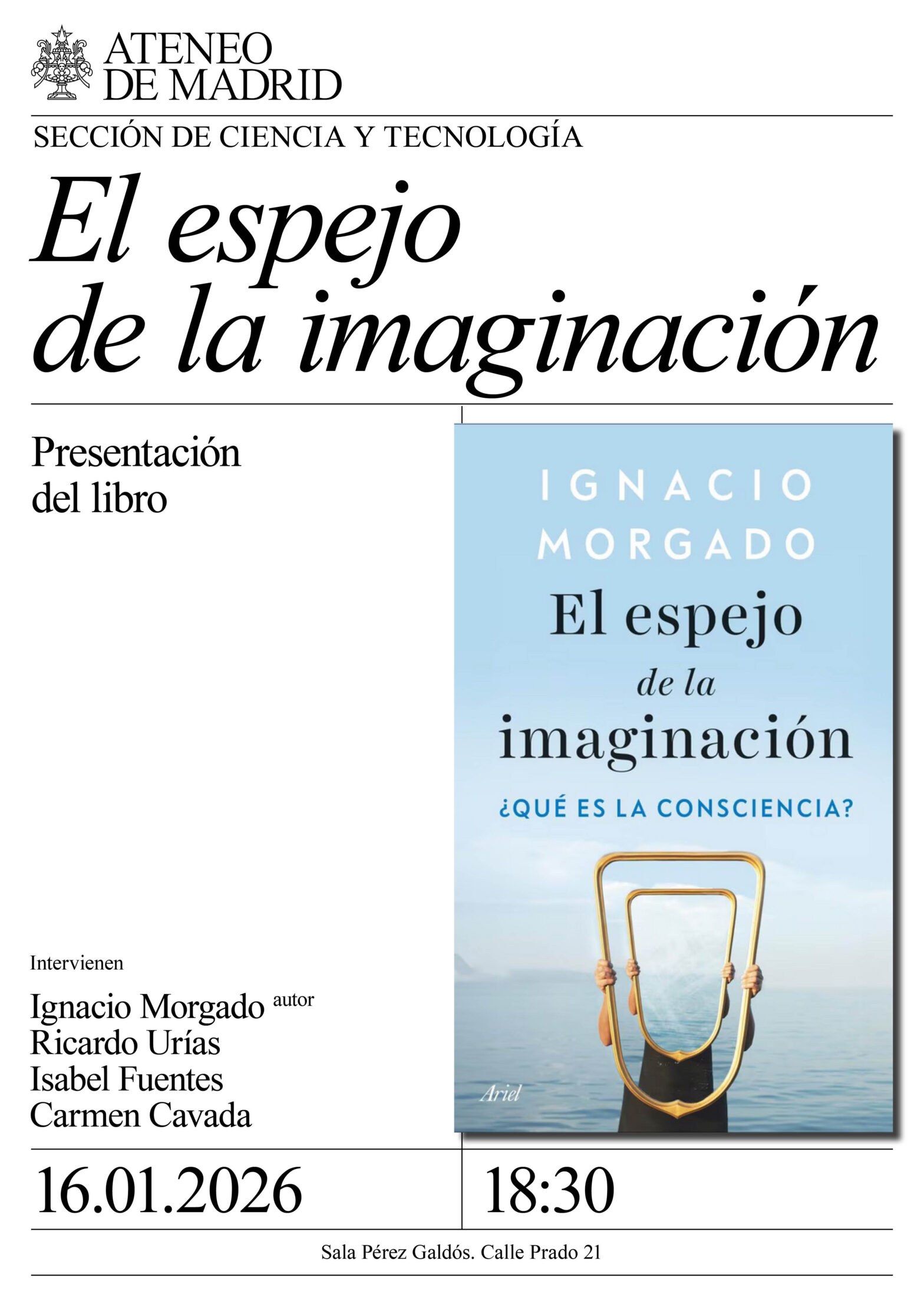 Sección de Ciencia y Tecnología. Intervienen: Ignacio Morgado, autor; Ricardo Urías, Isabel Fuentes y Carmen Cavada, catedrática de Anatomía y Embriología de la Universidad Autónoma de Madrid. Sala Pérez Galdós. 18:30h.