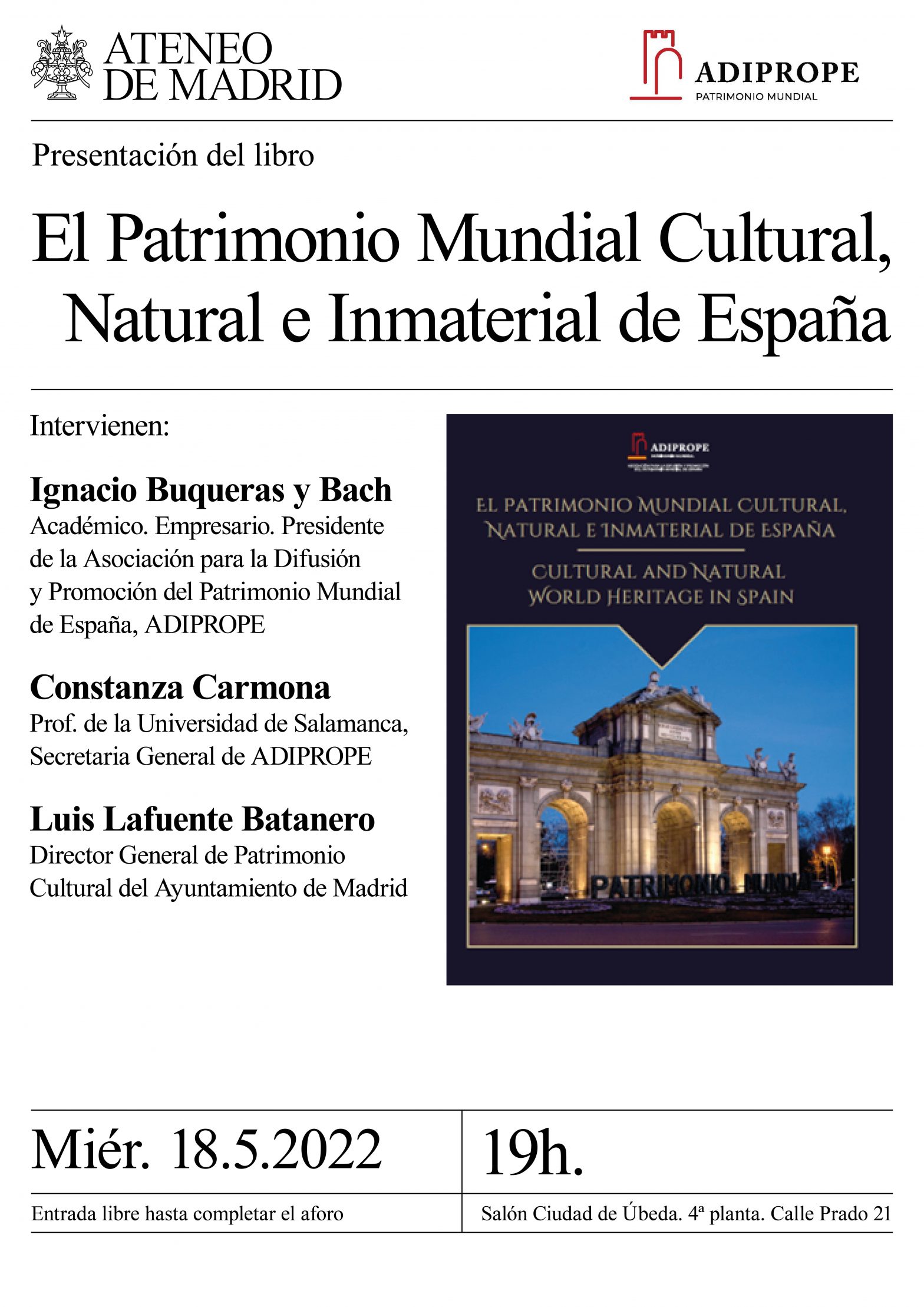 Promovido por ADIPROPE y editado por Mc Graw Hill. Intervienen: Ignacio Buqueras y Bach, académico, empresario, presidente de la Asociación para la Difusión y Promoción del Patrimonio Mundial de España, ADIPROPE; Constanza Carmona, prof. de la Universidad de Salamanca, secretaria General de ADIPROPE; Luis Lafuente Batanero, director General de Patrimonio Cultural del Ayuntamiento de Madrid. Salón Ciudad de Úbeda.