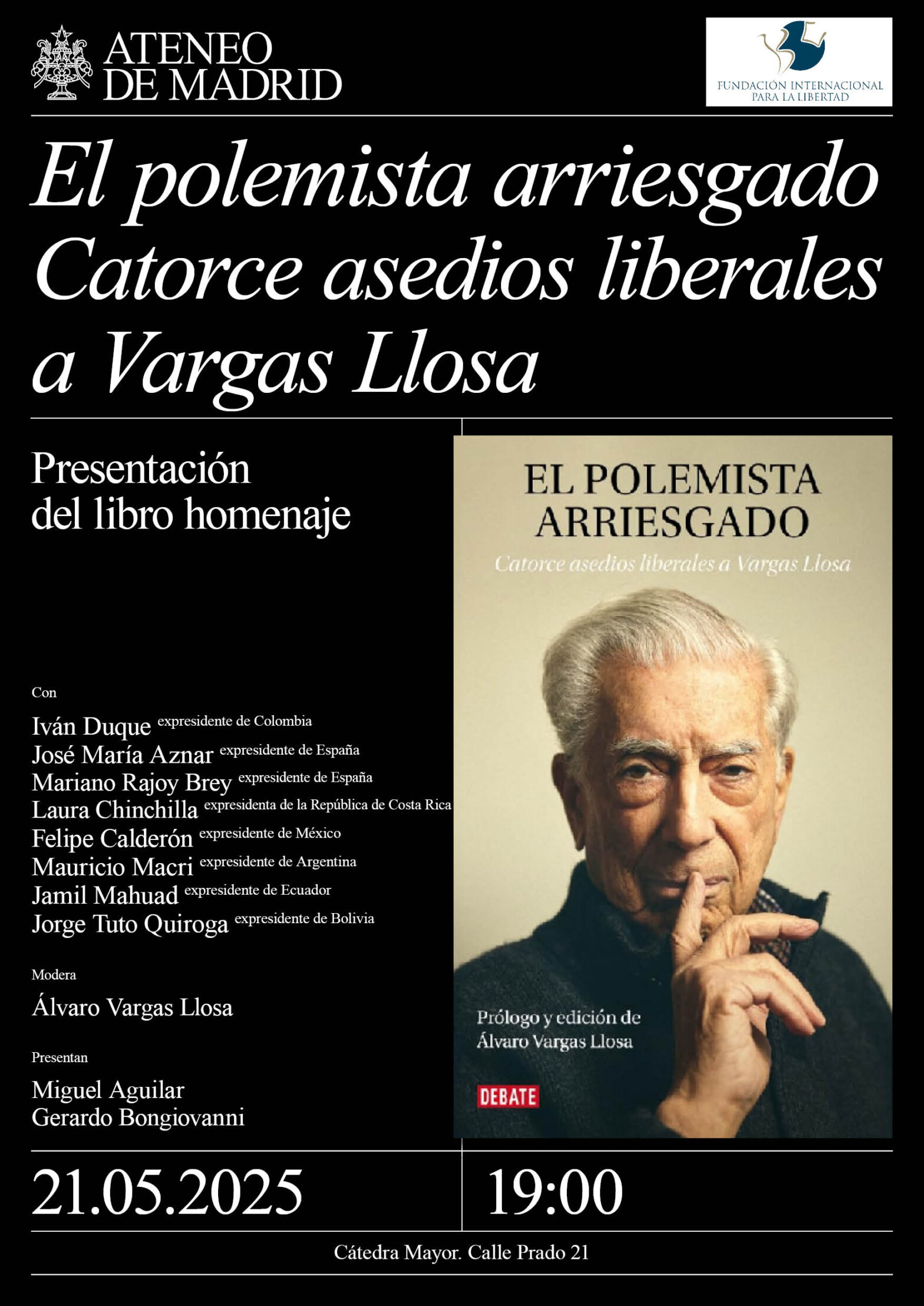 Con: Iván Duque, expresidente de Colombia; José María Aznar, expresidente de España; Mariano Rajoy Brey, expresidente de España; Laura Chinchilla, expresidenta de la República de Costa Rica; Felipe Calderón, expresidente de México; Mauricio Macri, expresidente de Argentina; Jamil Mahuad, expresidente de Ecuador; Alberto Nuñez Feijóo; presidente del PP, España; Mariano Rajoy Brey; expresidente de España; Iván Duque, expresidente de Colombia; Luis Lacalle Pou; expresidente de Uruguay; y Jorge Tuto Quiroga, expresidente de Bolivia. Modera Álvaro Vargas Llosa, periodista y escritor. Presentan: Miguel Aguilar, director literario de Debate y Gerardo Bongiovanni, director de FIL. Cátedra Mayor. 18:30h. Programa.