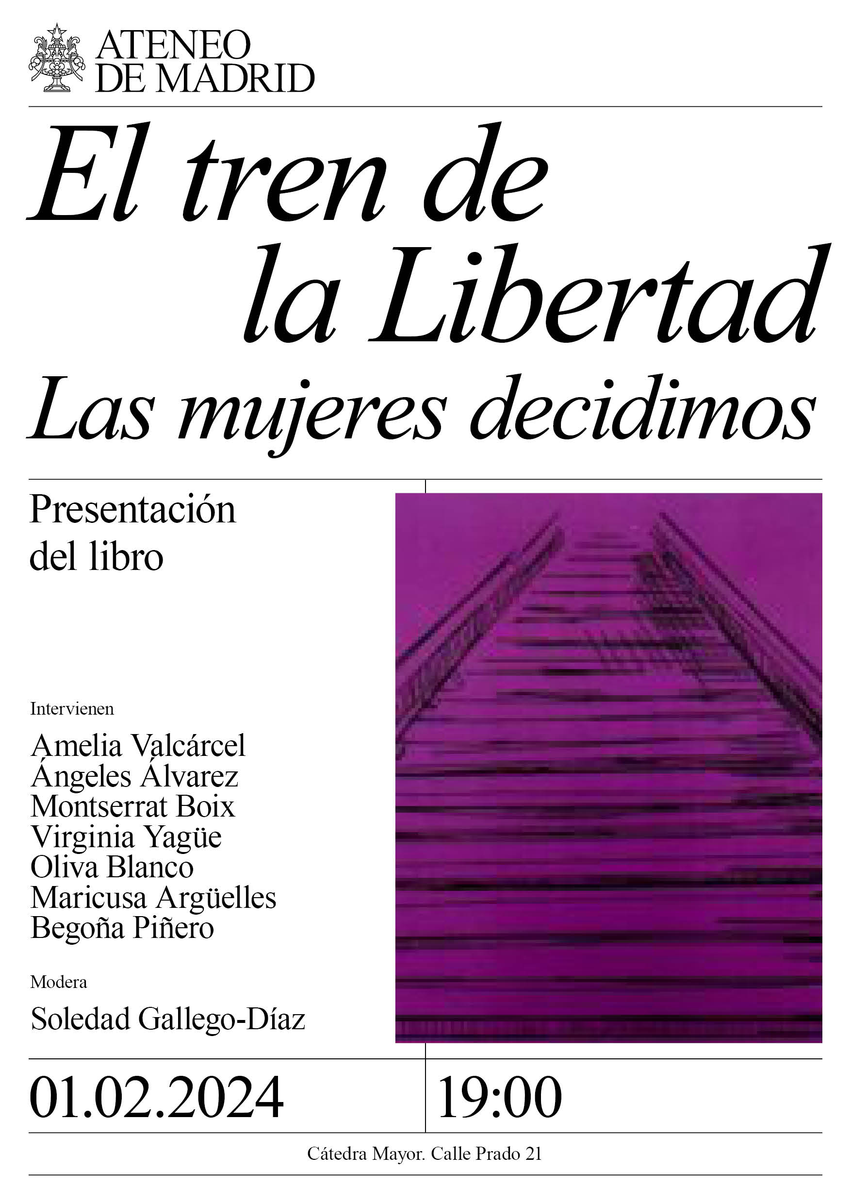 Intervienenen: Amelia Valcárcel, filósofa feminista, profesora emérita de Filosofía Moral y Política en la UNED. Ha sido vicepresidenta y vocal del Real Patronato del Museo del Prado, y miembro del Consejo de Estado hasta 2023. Ángeles Álvarez, activista feminista,y consultora y ex-diputada del PSOE. Montserrat Boix, periodista, feminista, defensora del derecho a la comunicación y los derechos de ciudadanía para las mujeres. Virginia Yagüe, escritora, guionista, productora, feminista, presidenta de DAMA (Derechos de autor en medios audiovisuales), expresidenta de CIMA (Asociación de mujeres cineastas y de medios audiovisuales). Oliva Blanco, escritora, editora, comisaria cultural, feminista y creadora de la página “Fábrica de la Memoria”. Maricusa Argüelles, activista feminista, Asociación Mujeres por la Igualdad de Barredos y organizadora del Tren de la Libertad. Begoña Piñero, activista feminista, presidenta de la Tertulia Feminista Les Comadres y organizadora y portavoz del “Tren de la Libertad”. Modera: Soledad Gallego-Díaz, periodista y ex-directora del diario El País. Cátedra Mayor. 19:00h.