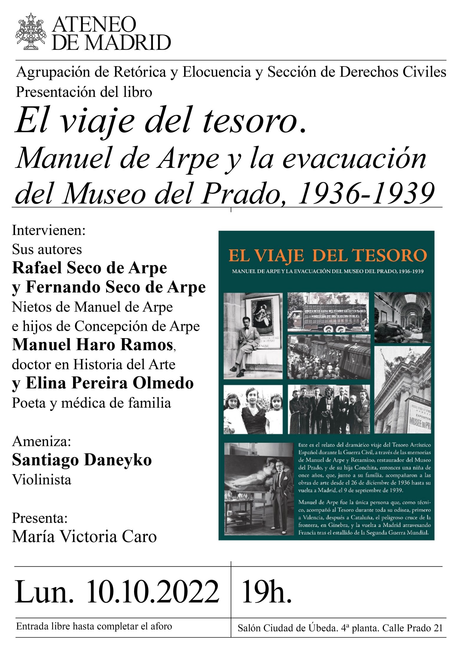 Agrupación de Retórica y Elocuencia y Sección de Derechos Civiles Presentación del libro El viaje del tesoro. Manuel de Arpe y la evacuación del Museo del Prado, 1936-1939. Intervienen: sus autores Rafael Seco de Arpe y Fernando Seco de Arpe, nietos de Manuel de Arpe e hijos de Concepción de Arpe; Manuel Haro Ramos, doctor en Historia del Arte y Elina Pereira Olmedo, poeta y médico de familia. Ameniza: Santiago Daneyko, violinista. Presenta: