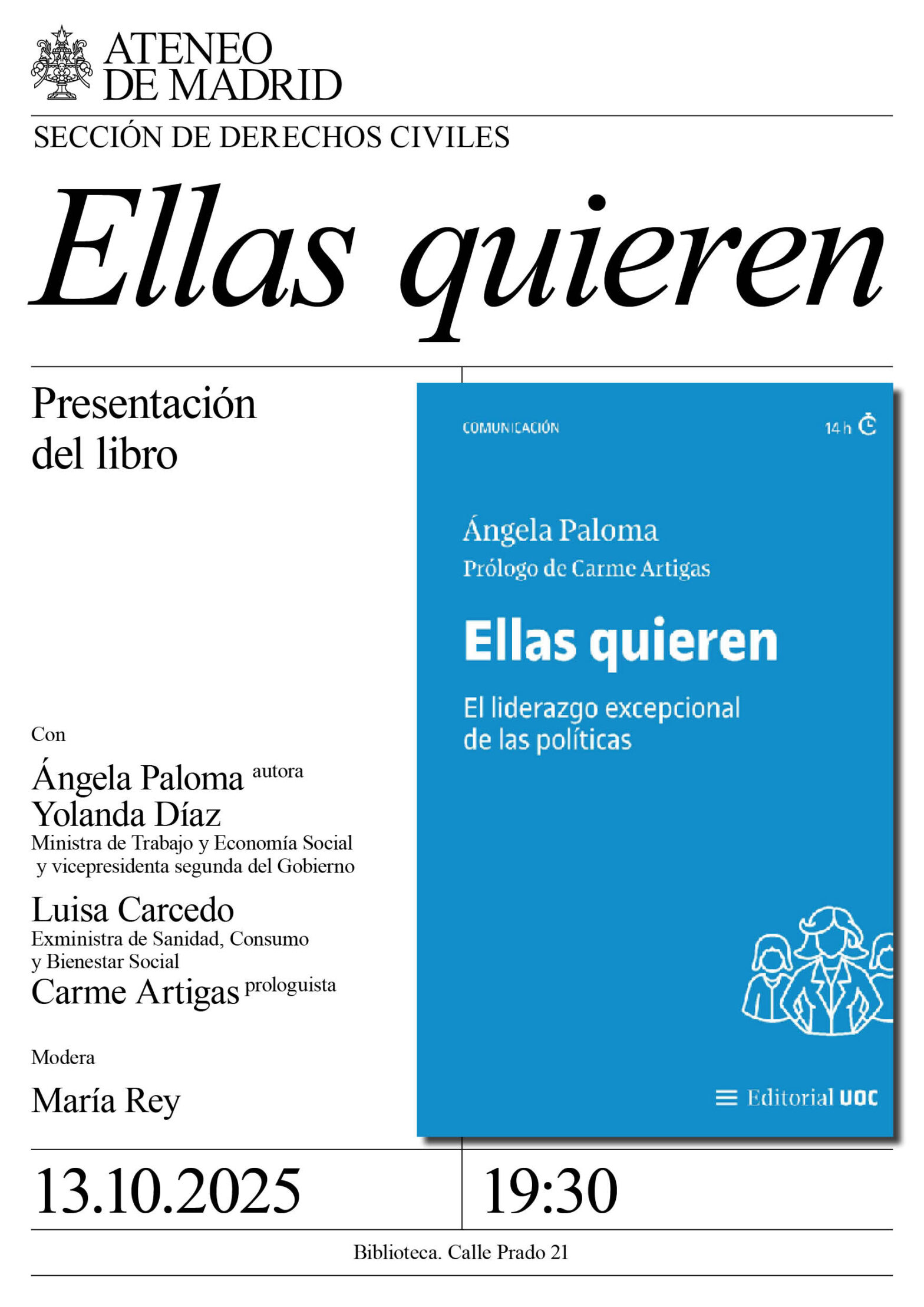 Sección de Derechos Civiles. Con: Yolanda Díaz, ministra de Trabajo y Economía Social y vicepresidenta segunda del Gobierno; Ángela Paloma, autora; Luisa Carcedo, exministra de Sanidad, Consumo y Bienestar Social; y Carme Artigas, prologuista. Modera la periodista María Rey. Biblioteca. 19:30h.