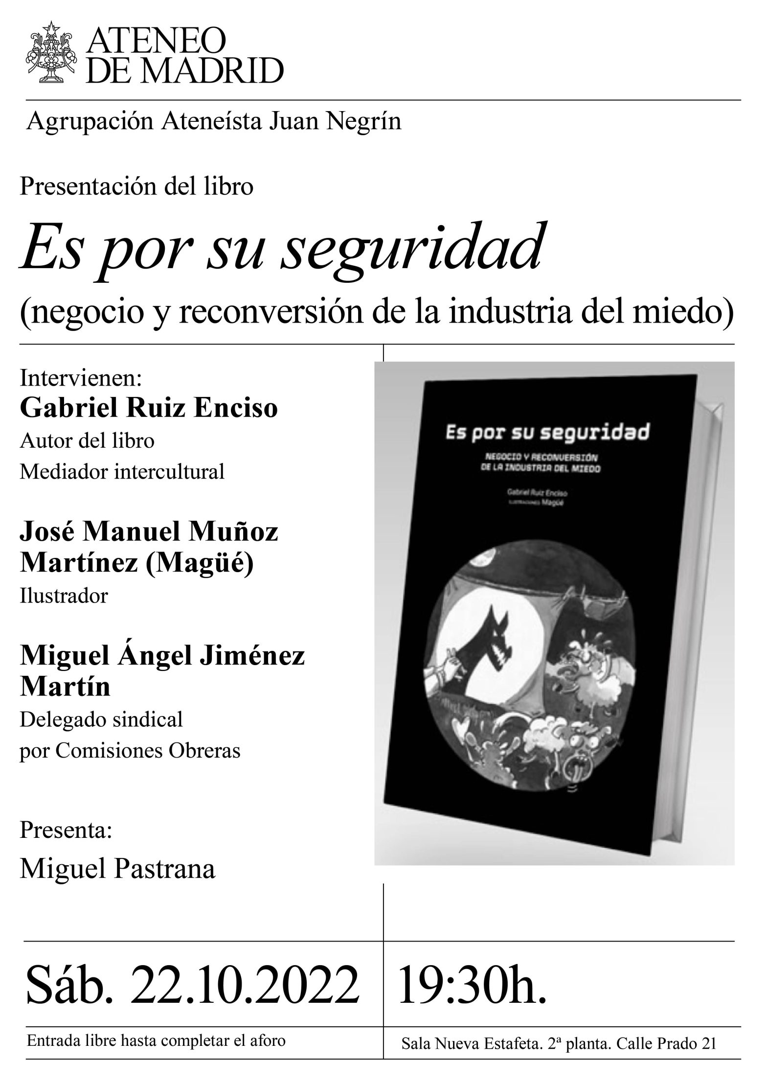 Agrupación Ateneísta Juan Negrín. Presentación del libro Es por su seguridad (negocio y reconversión de la industria del miedo). Intervienen: Gabriel Ruiz Enciso, autor del libro. Mediador intercultural; José Manuel Muñoz Martínez «Magüe», ilustrador y Miguel Ángel Jiménez Martín, delegado sindical por Comisiones Obreras). Presenta Miguel Pastrana. Sala Nueva Estafeta. 19.30 h.