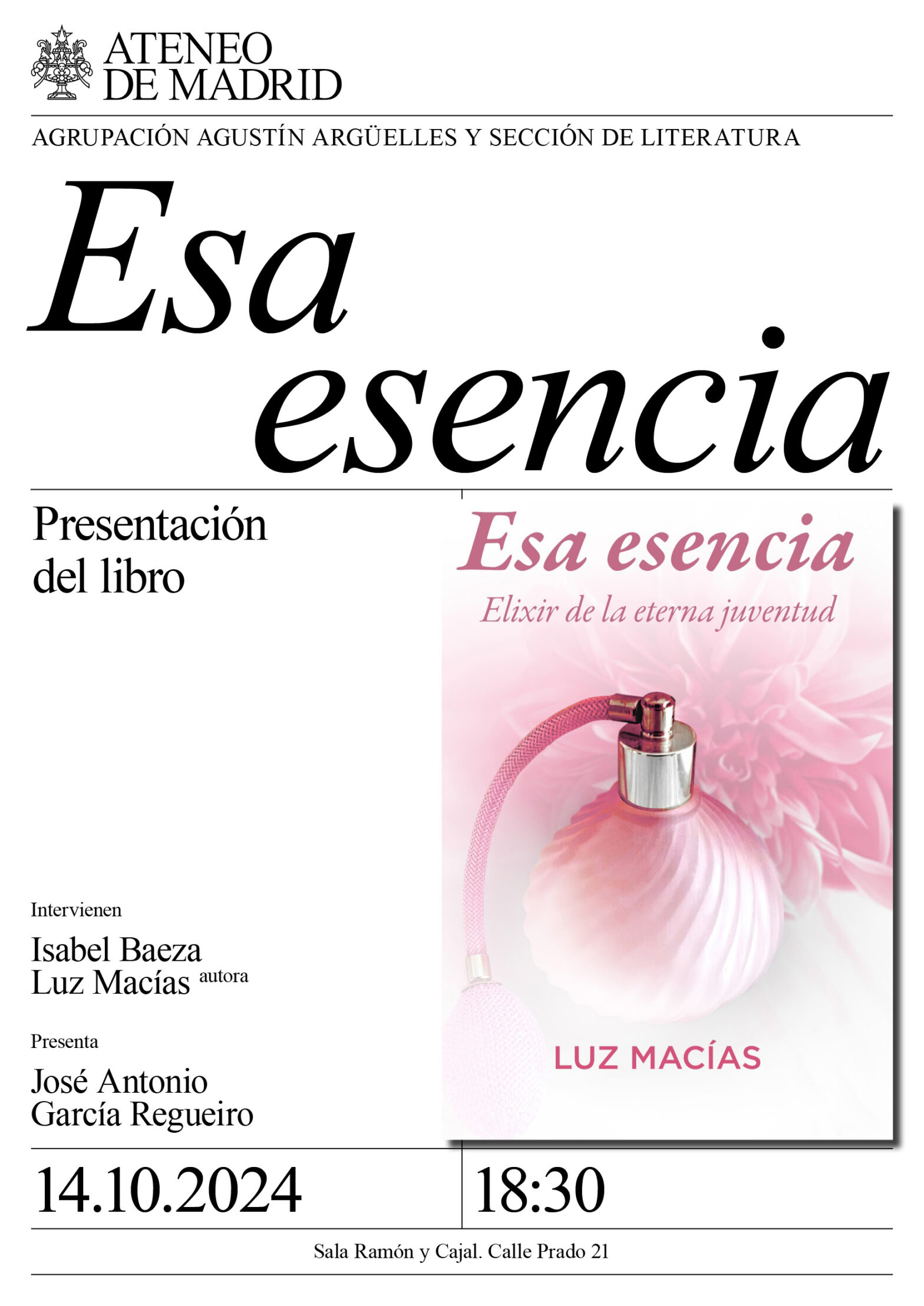 Agrupación Agustín Argüelles y Sección de Literatura. Presenta: José Antonio García Regueiro. Intervienen: Isabel Baeza, escritora y Luz Macías, autora. Sala Ramón y Cajal. 18:30h.