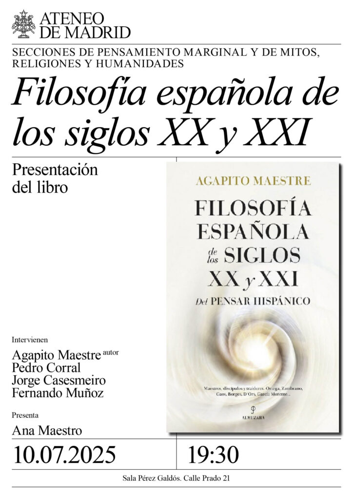 Sección de Mitos, Religiones y Humanidades. Interviene Agapito Maestre, autor; Pedro Corral, Jorge Casesmeiro y Fernando Muñoz. Presenta: Ana Maestro. Sala Pérez Galdós. 19:30h.