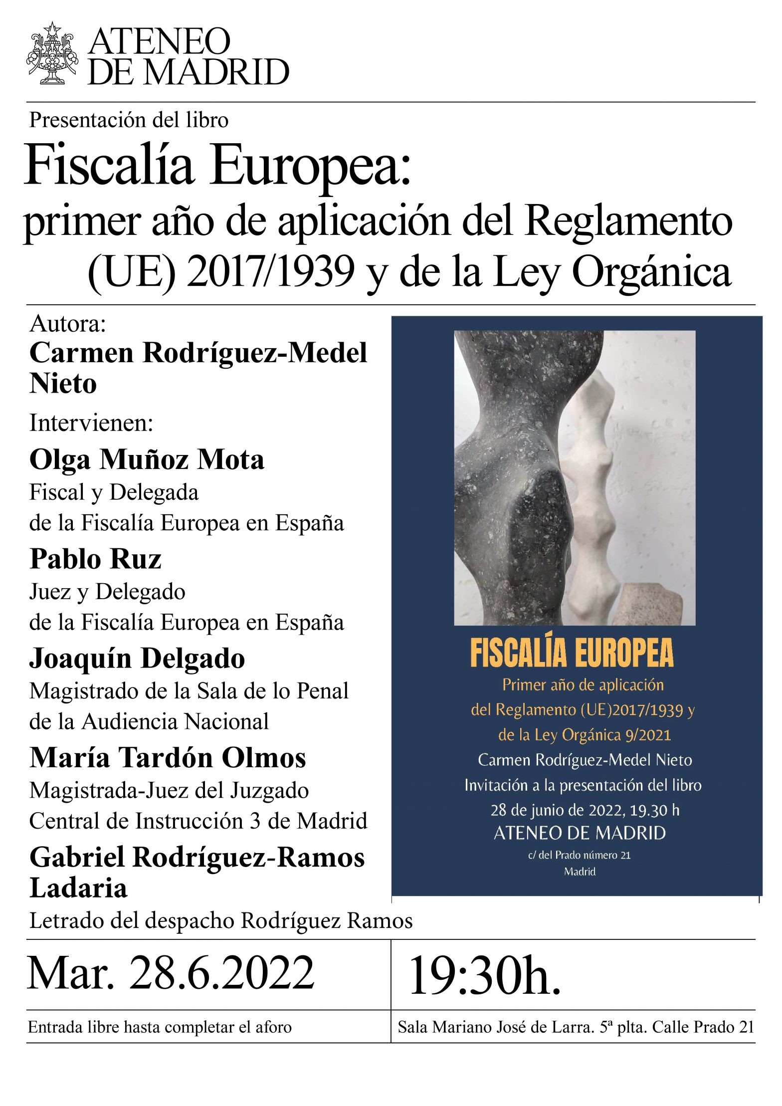Autora Carmen Rodríguez Medel. Intervienen: Olga Muñoz Mota y Pablo Ruz, ambos fiscal y juez, respectivamente, trabajando en la actualidad como Delegados de la Fiscalía Europea en España, Joaquín Delgado, magistrado de la Sala de lo Penal de la Audiencia Nacional) María Tardón Olmos, Magistrada-Juez del Juzgado Central de Instrucción 3 de Madrid y Gabriel Rodríguez-Ramos Ladaria, Letrado del despacho Rodríguez Ramos. Sala Larra 19.30 h.