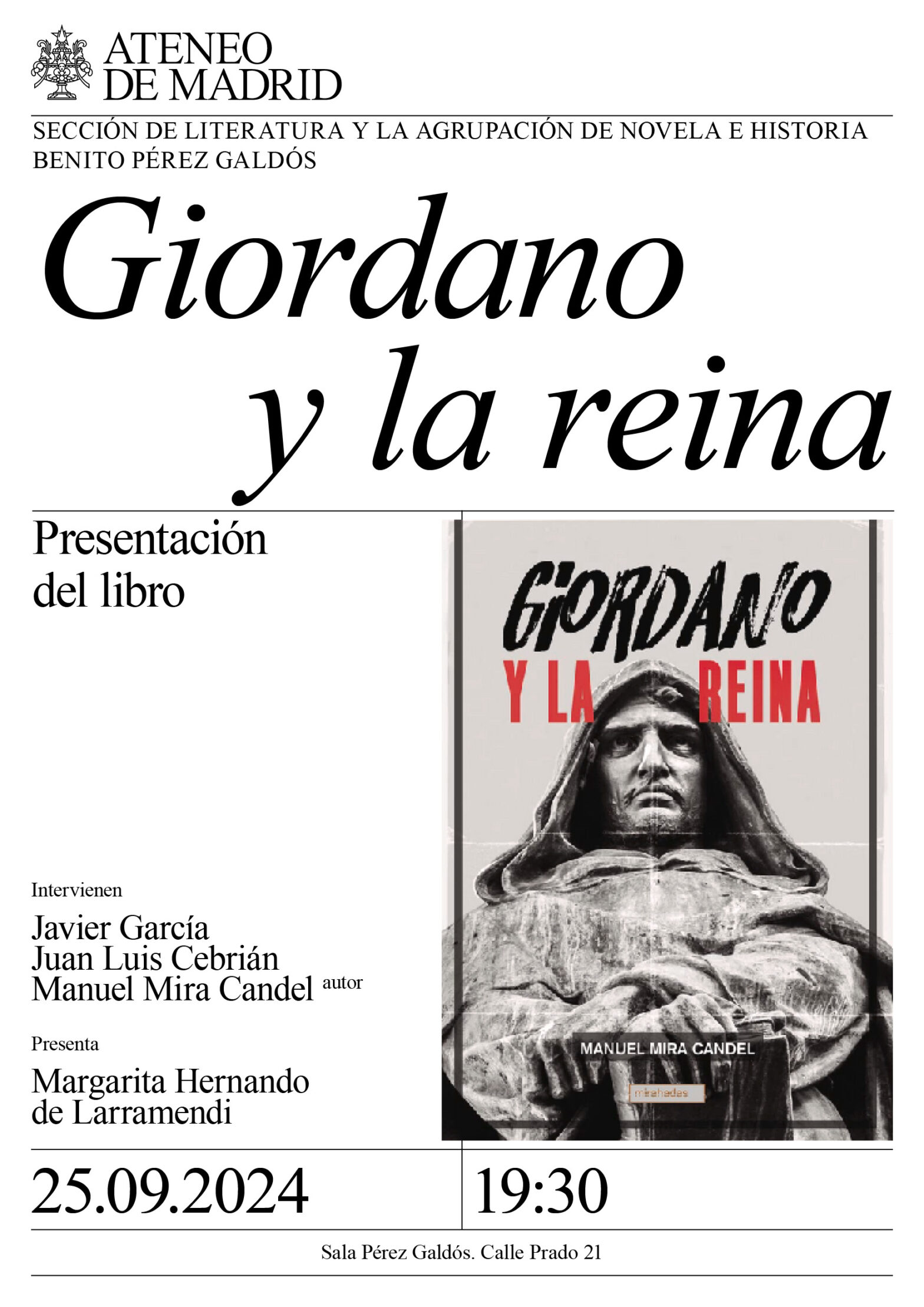 Sección de Literatura y la Agrupación de Novela e Historia Benito Pérez Galdós. Intervienen: Javier García, periodista y profesor asociado de Imagen Corporativa en la Universidad de Alicante; Juan Luis Cebrián, miembro de la Real Academia Española y periodista; y Manuel Mira Candel, periodista, escritor y autor de la novela. Presenta: Margarita Hernando de Larramendi. Sala Pérez Galdós. 19:30h.