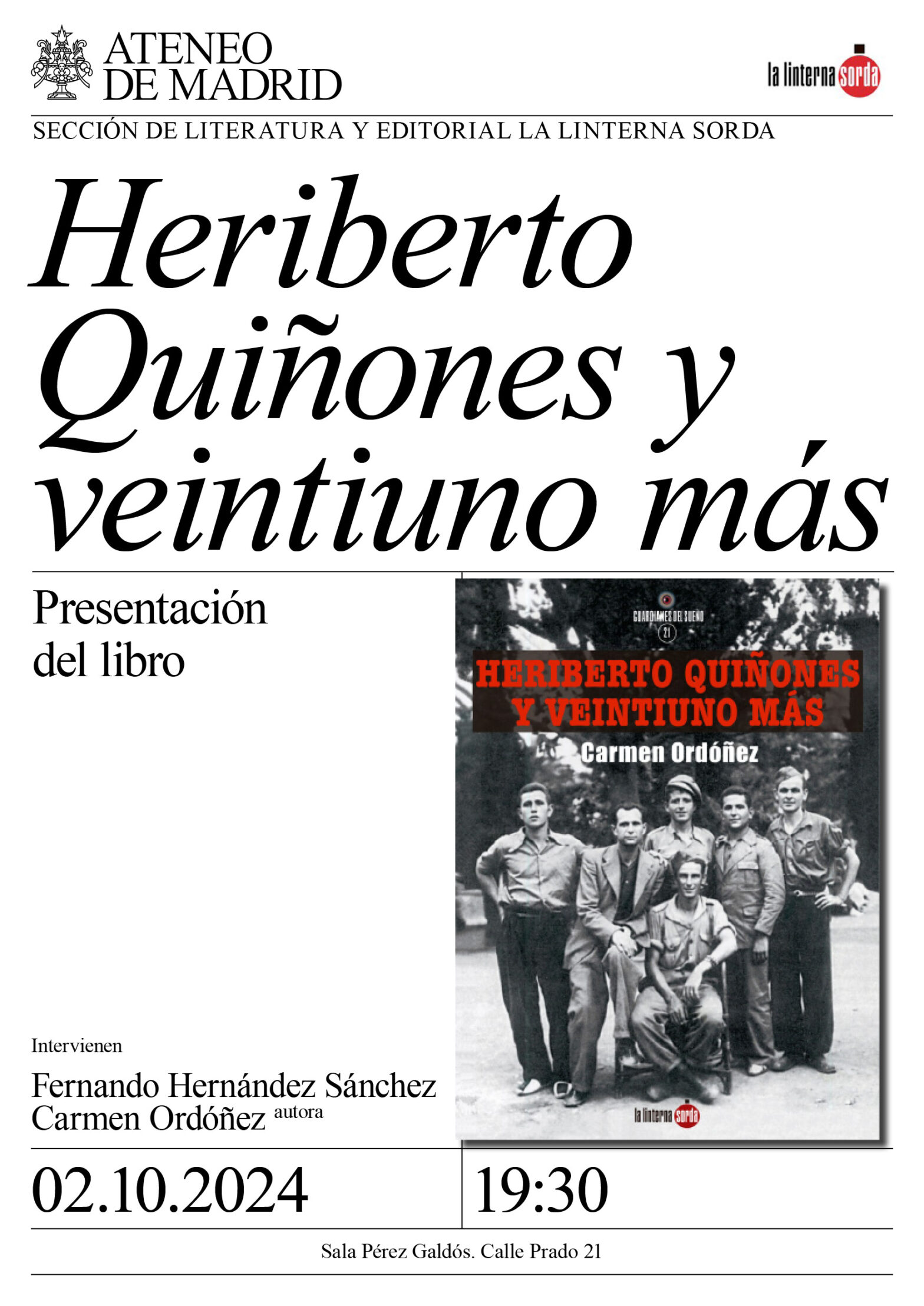 Heriberto Quiñones y veintiuno más es un trabajo de investigación que parte del examen exhaustivo de un sumario judicial de 1942. Quiñones, cuyo nombre real desconocemos, fue un agente de la Komintern, un luchador antifascista que vivió en España en la década de los años treinta. Fue el compañero de Aurora Picornell, conocida como La Pasionaria mallorquina, asesinada en una tapia en 1937.