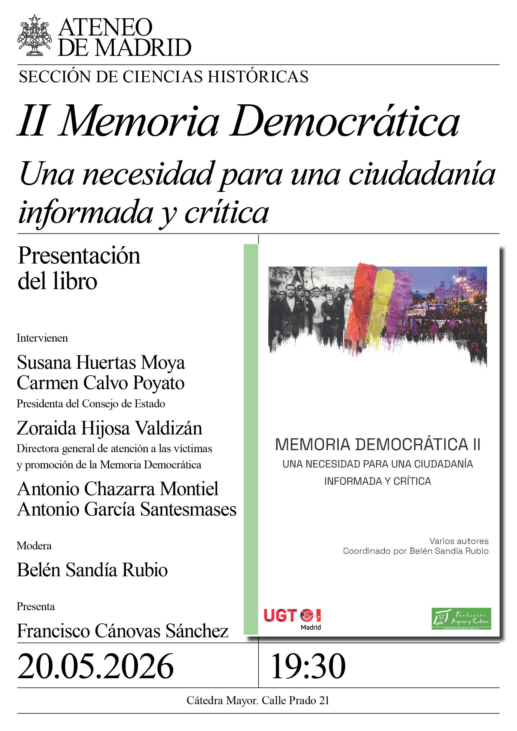 Sección de Ciencias Históricas. Presenta: Francisco Cánovas Sánchez, historiador y escritor. Intervienen: Susana Huertas Moya, secretaria general de UGT Madrid; Carmen Calvo Poyato, presidenta del Consejo de Estado; Zoraida Hijosa Valdizán; directora general de atención a las víctimas y promoción de la Memoria Democrática; Antonio Chazarra Montiel, profesor de Filosofía y escritor; y Antonio García Santesmases, catedrático de Filosofía Política UNED. Modera: Belén Sandía Rubio, Directora de la Fundación Progreso y Cultura. Cátedra Mayor. 19:30h.