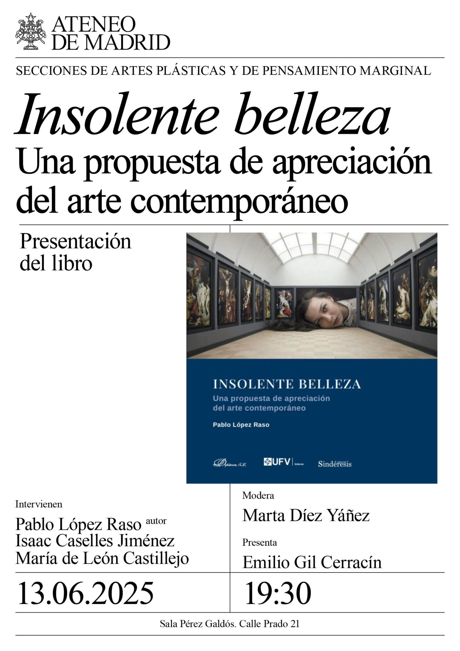Secciones de Artes Plásticas y de Pensamiento Marginal. Intervienen: Pablo López Raso, autor, catedrático de Arte Contemporáneo en la Universidad Francisco de Vitoria; Isaac Caselles Jiménez, director de la Editorial UFV; y María de León Castillejo, comunicadora y coach. Modera Marta Díez Yáñez. coordinadora de actividades culturales en Familias UFV. Presenta Emilio Gil Cerracín. Sala Pérez Galdós. 19:30h.