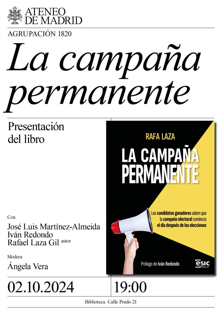 Agrupación 1820. Con José Luis Martínez-Almeida, Iván Redondo, Ángela Vera y Rafael Laza Gil, autor. Biblioteca. 19:00h.
