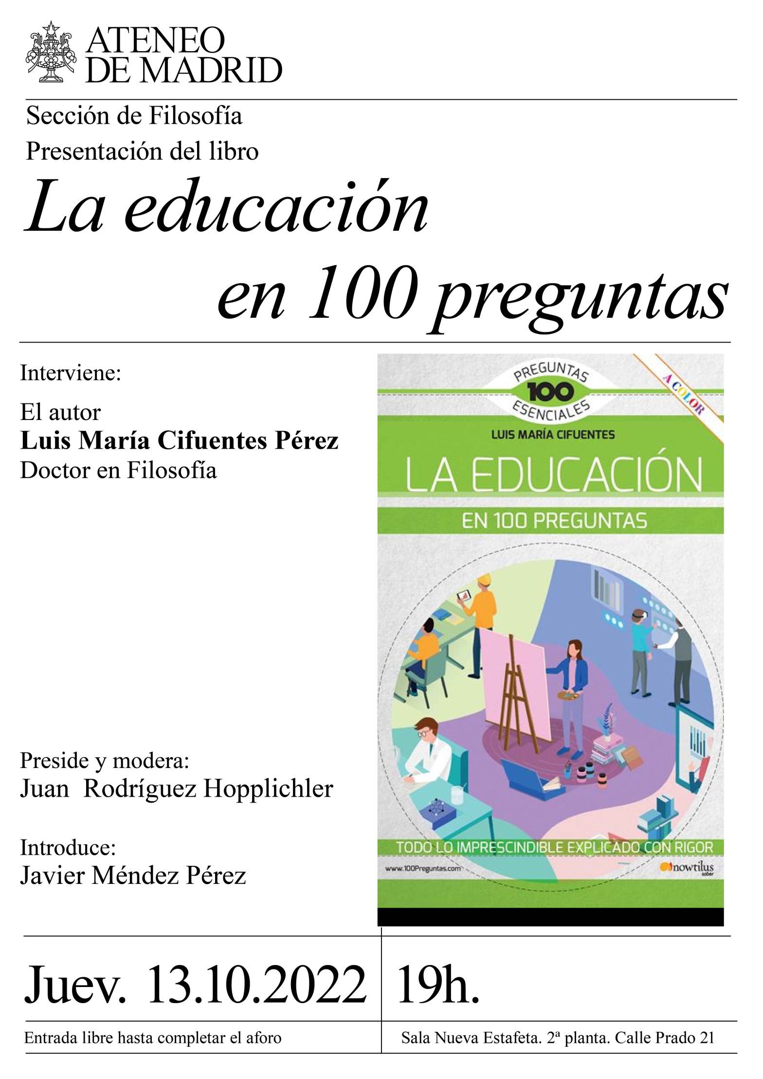 Sección de Filosofía. Intervienen el autor, Luis María Cifuentes Pérez, Doctor en Filosofía por la Universidad Complutense de Madrid. Preside y modera Juan Rodríguez Hopplichler. Introduce Javier Méndez Pérez. Sala Nueva Estafeta. 19 h.