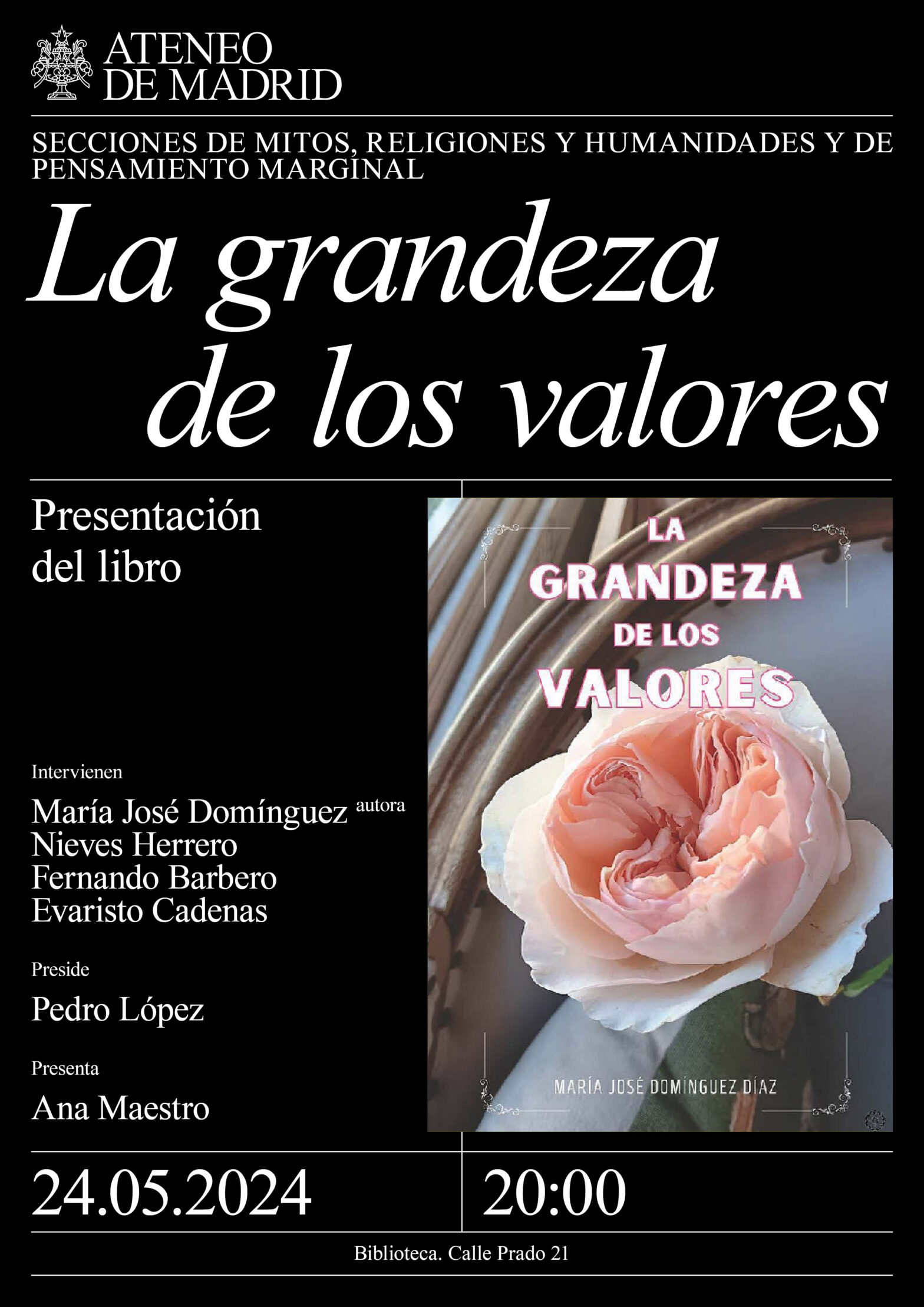 Secciones de Mitos, Religiones y Humanidades y de Pensamiento Marginal. Intervienen: María José Domínguez, autora; Nieves Herrero, periodista; Fernando Barbero, escritor; y Evaristo Cadenas, poeta y escritor. Preside: Pedro López. Presenta: Ana Maestro. Biblioteca. 20:00h.