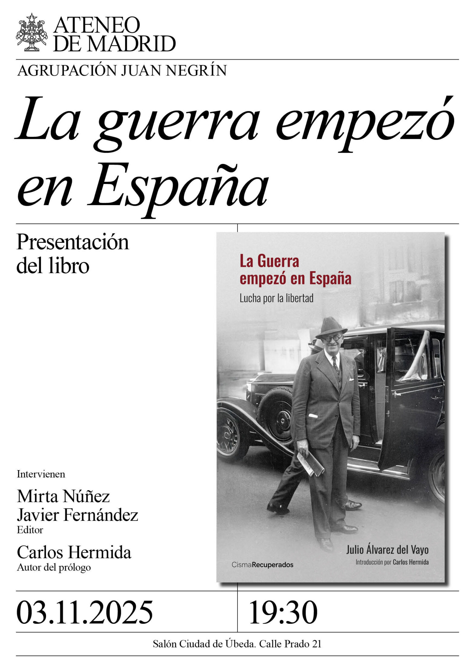 Agrupación Juan Negrín. Ponentes: Mirta Núñez, doctora en Historia Contemporánea y catedrática de la Universidad Complutense de Madrid, autora de numerosas obras y especializada en la represión franquista; Javier Fernández, editor de CISMA; y Carlos Hermida, doctor en Historia Contemporánea y autor del prólogo.