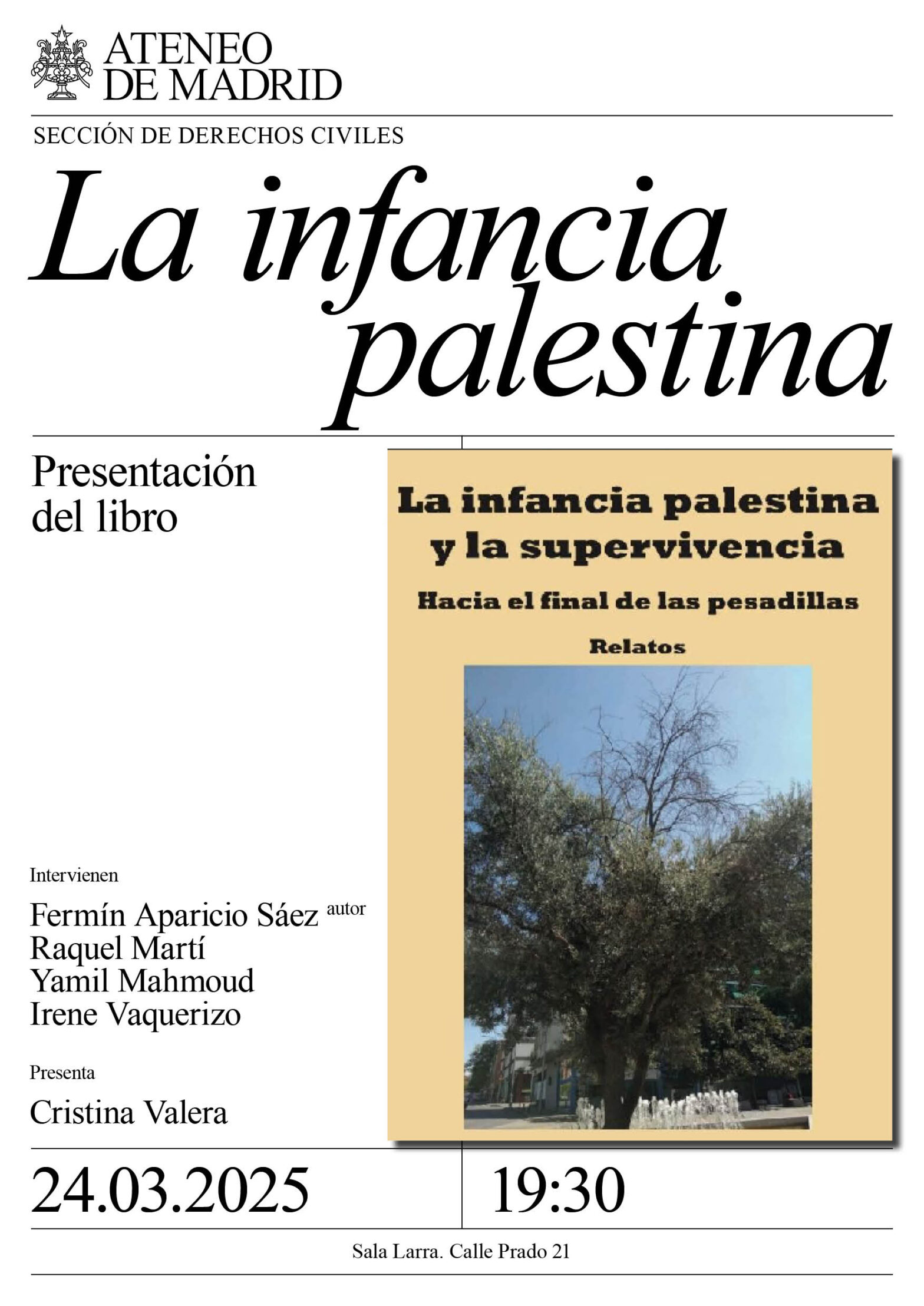 Sección de Derechos Civiles. Intervienen: Fermín Aparicio Sáez, autor; Raquel Martí (UNRWA); Yamil Mahmoud, prologuista; e Irene Vaquerizo (TVE). Presenta Cristina Valera. Sala Larra. 19:30h. Nota de prensa.