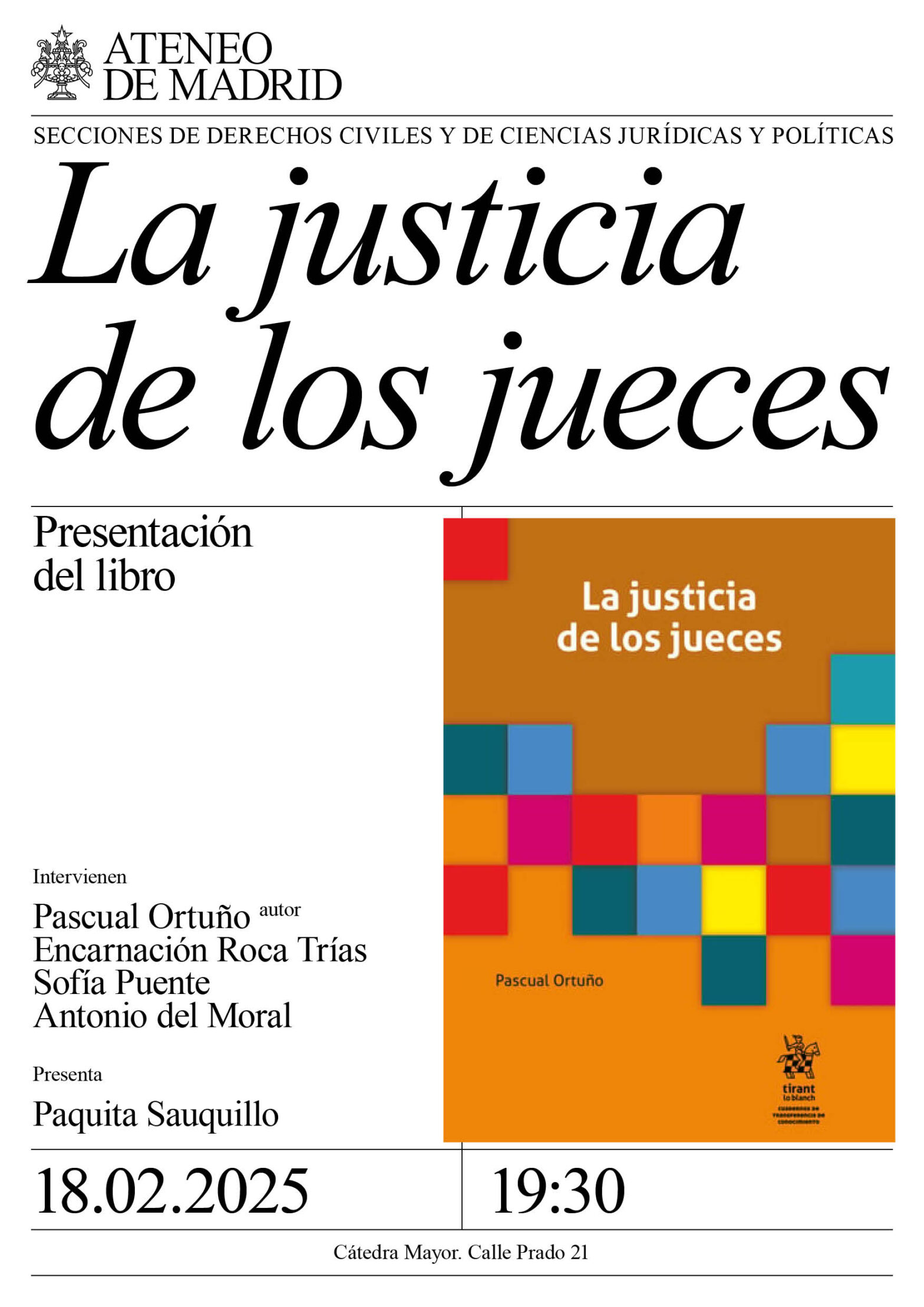 Secciones de Derechos Civiles y de Ciencias Políticas y Jurídicas. Intervienen: Pascual Ortuño, autor del libro, exmagistrado y exdirector de la Escuela Judicial Española; Encarnación Roca Trías, exmagistrada en la Sala de lo Civil del Tribunal Supremo, exmagistrada y exvicepresidenta del Tribunal Constitucional; Sofía Puente, fiscal y secretaria general para la Innovación y Calidad del Servicio Público de Justicia; y Antonio del Moral, magistrado del Tribunal Supremo. Presenta Paquita Sauquillo. Cátedra Mayor. 19:30h.