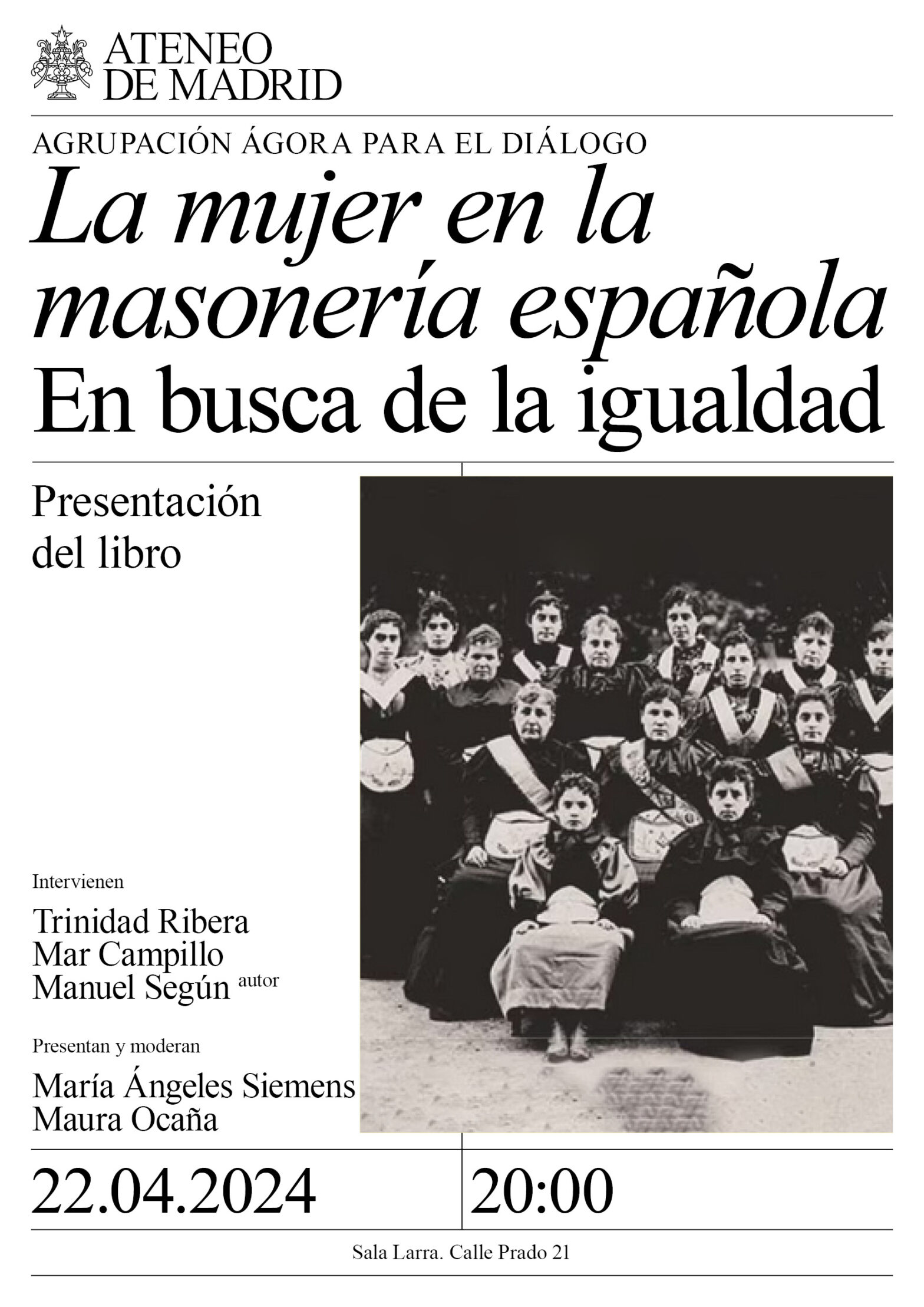 Agrupación Ágora para el Diálogo. Intervienen: Trinidad Ribera, médico y gran maestra del Gran Oriente Femenino de España; Mar Campillo, periodista, editora y venerable maestra de la Logia Arte Real de la Gran Logia Simbólica Española; y Manuel Según, historiador y autor del libro. Presentan y moderan: María Ángeles Siemens y Maura Ocaña. Sala Larra. 20:00h.