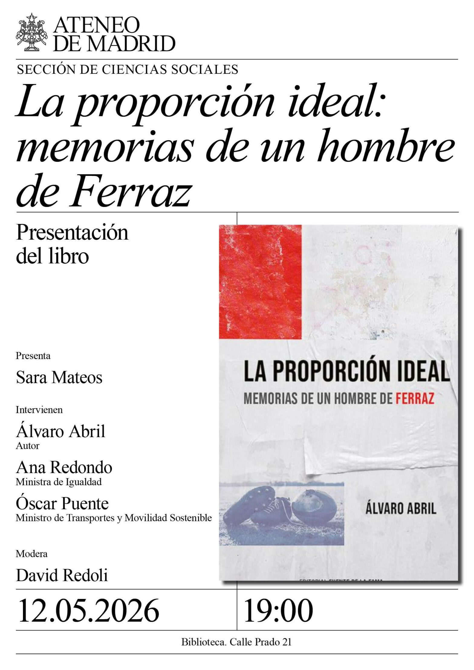 Sección de Ciencias Sociales. Intervienen: Sara Mateos, presentadora; Álvaro Abril, autor; Ana Redondo, ministra de Igualdad; Óscar Puente, ministro de Transportes y Movilidad Sostenible; y David Redoli, moderador. Biblioteca. 19:00h.