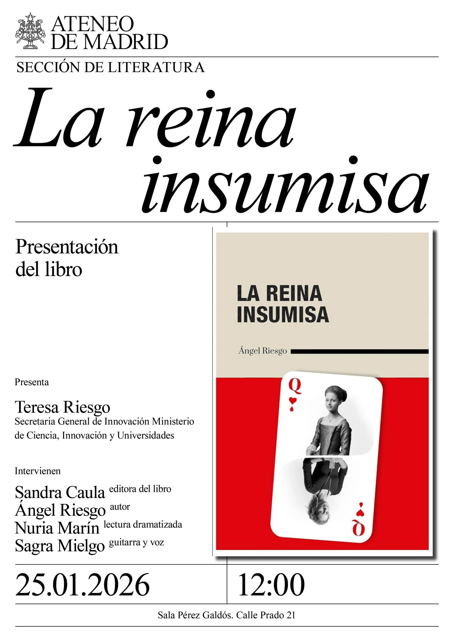 Sección de Literatura. Presenta: Teresa Riesgo, secretaria general de Innovación Ministerio de Ciencia, Innovación y Universidades. Interviene: Sandra Caula, editora del libro; Ángel Riesgo, autor; Nuria Marín, lectura dramatizada; y Sagra Mielgo, guitarra y voz. Sala Pérez Galdós. 12:00h.