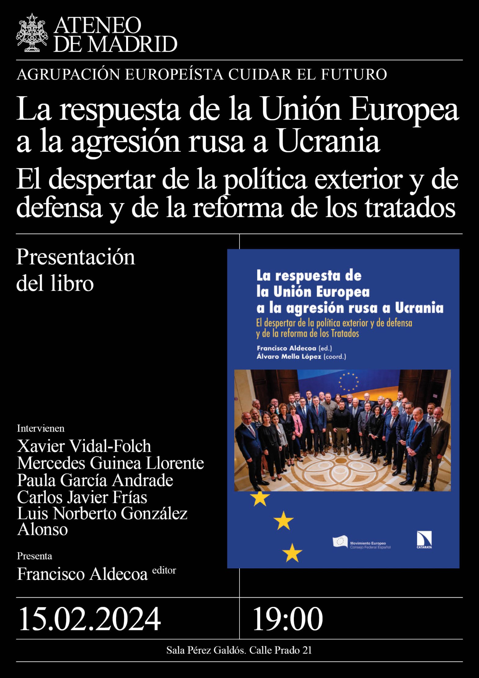 Agrupación Europeísta Cuidar el futuro. Intervienen: Xavier Vidal-Folch, periodista y director adjunto del diario El País. Mercedes Guinea Llorente, profesora de Relaciones Internacionales en la UCM y miembro de la Comisión Ejecutiva del CFEME. Paula García Andrade, profesora de Derecho Comunitario y Derecho Internacional Público en la Universidad Pontificia Comillas. Carlos Javier Frías, general de brigada y director de la Escuela de Guerra del Ejército de Tierra español. Luis Norberto González Alonso, secretario general del CFEME. Presenta: Francisco Aldecoa. Sala Pérez Galdós. 19:00h.