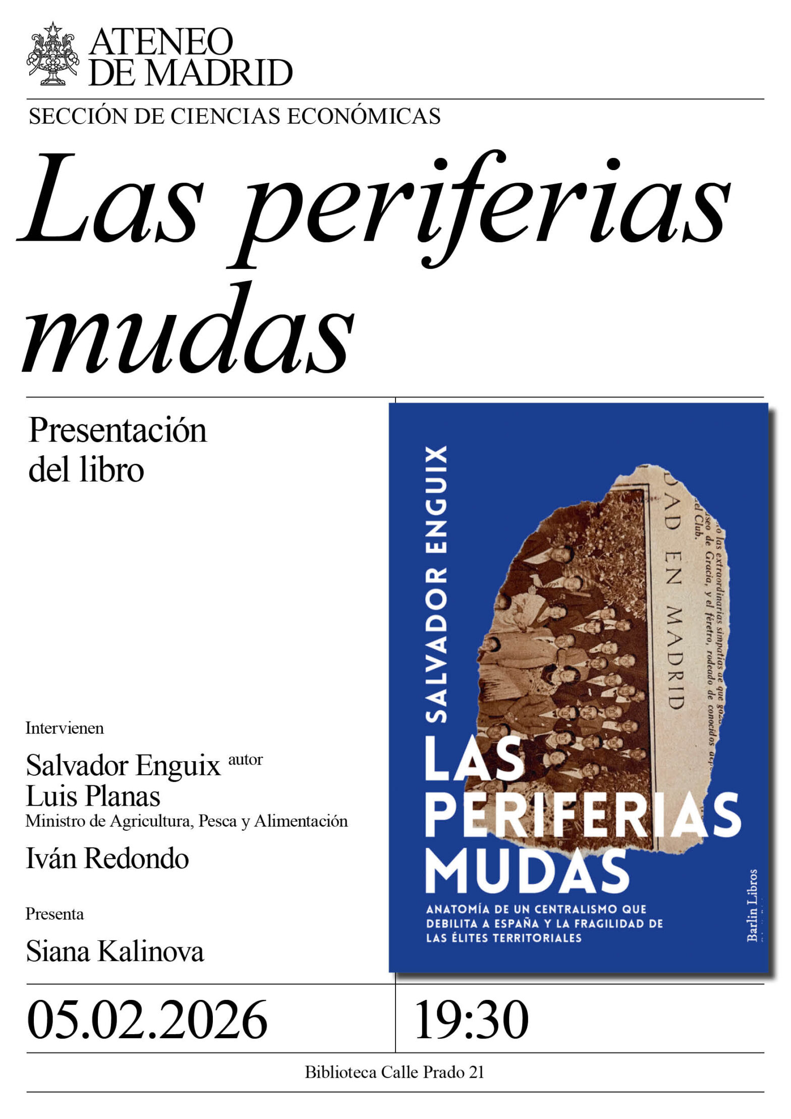 Sección de Ciencias Económicas. Intervienen: Salvador Enguix, autor, escritor y periodista de La Vanguardia; Luis Planas, ministro de Agricultura, Pesca y Alimentación; e Iván Redondo, asesor político, exjefe de gabinete del gobierno de España. Presenta: Siana Kalinova. Biblioteca. 19:30h.