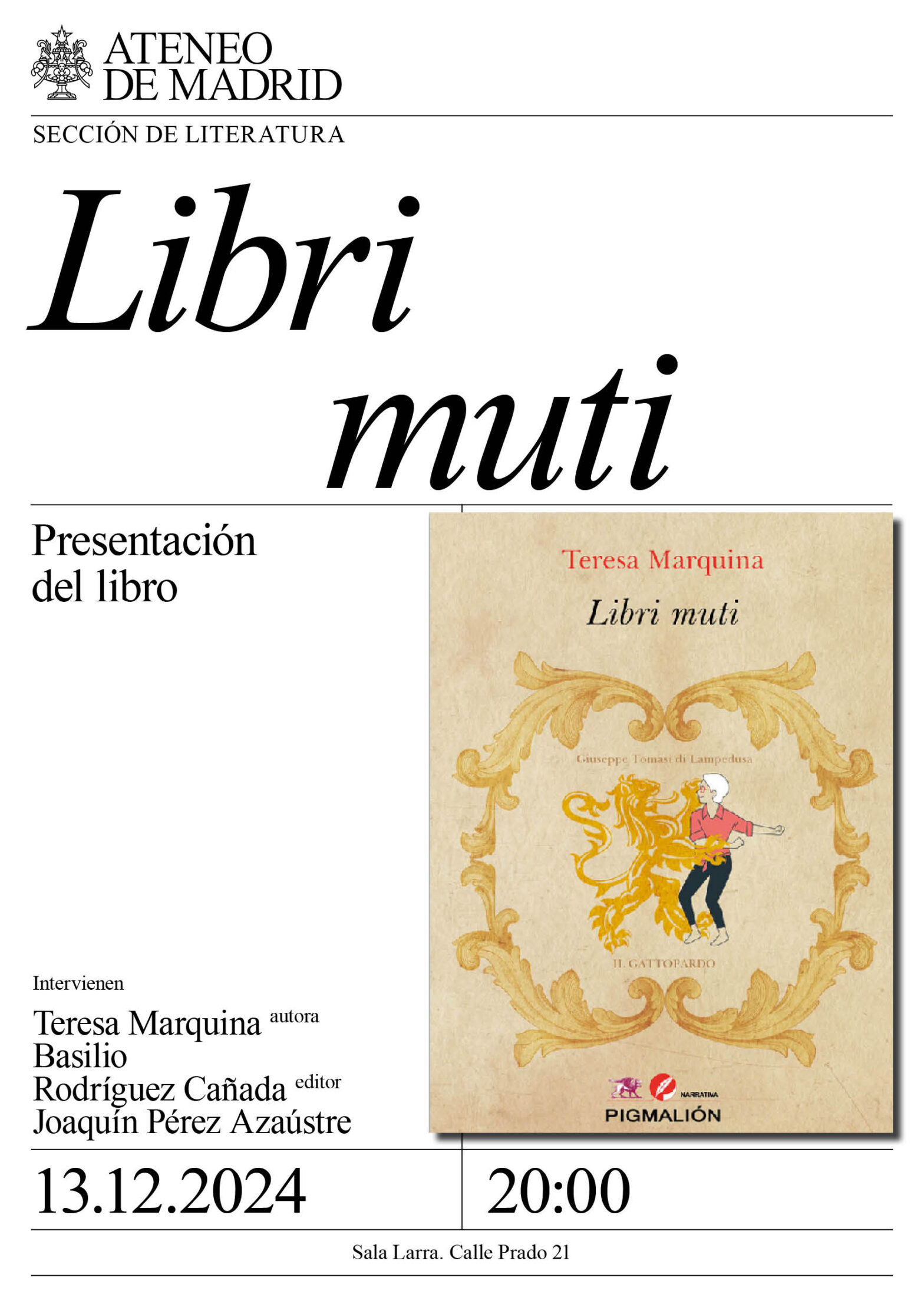 Sección de Literatura. Intervienen: Teresa Marquina, autora; Basilio Rodríguez Cañada, editor; y Joaquín Pérez Azaústre. Sala Larra. 20:00h.