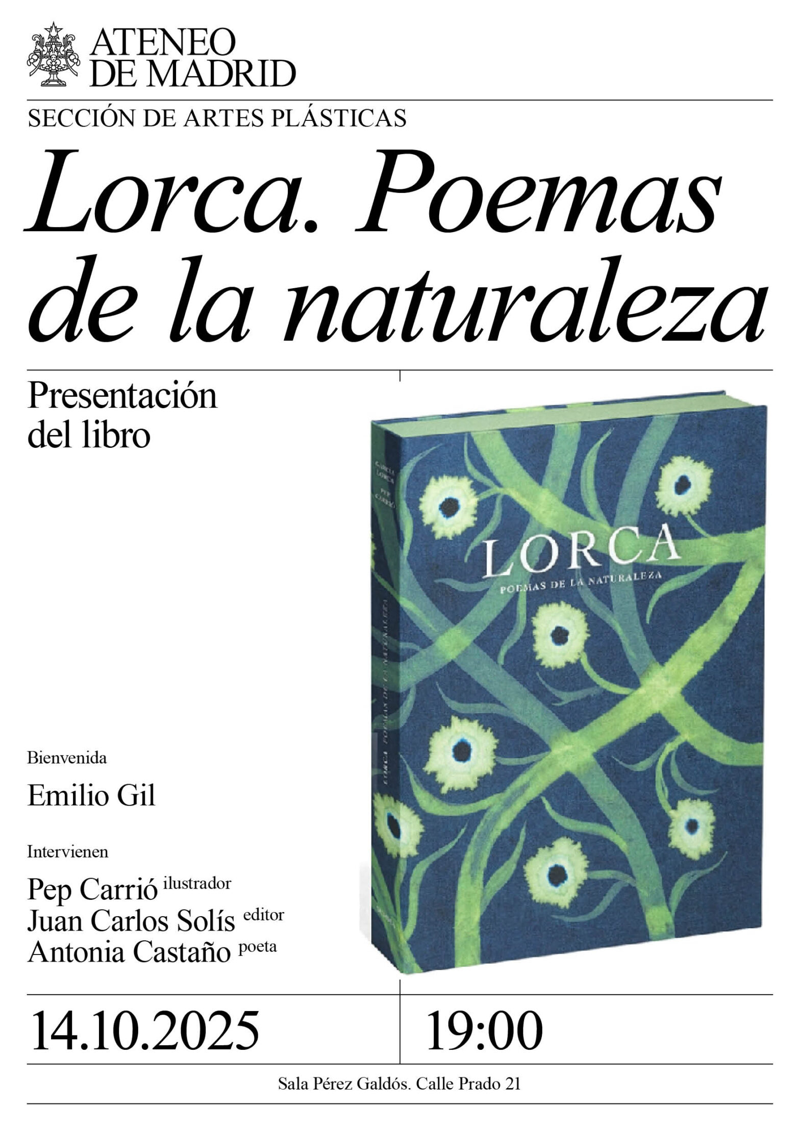 Sección de Artes Plásticas. Bienvenida: Emilio Gil. Intervienen: Pep Carrió, ilustrador, Juan Carlos Solís, editor Summa Arte y Bibliofilia; y Antonia Castaño, poeta. Sala Pérez Galdós. 19:00h.