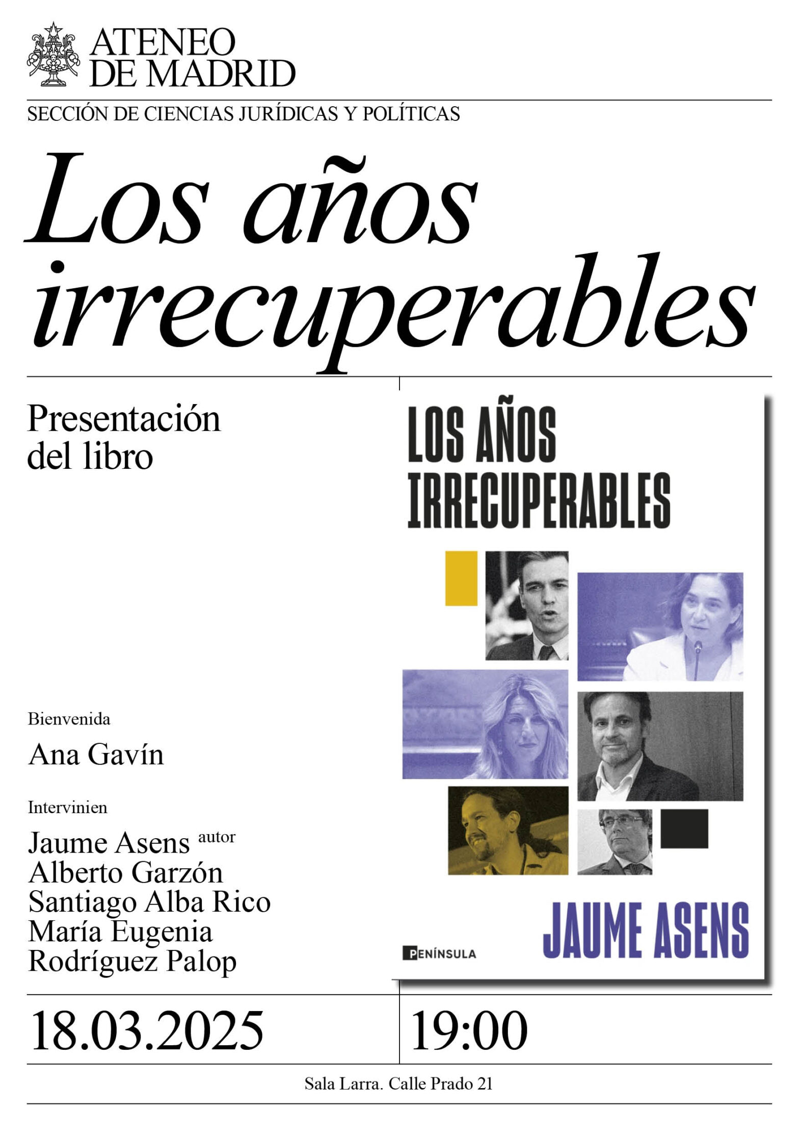 Sección de Ciencias Jurídicas y Políticas. Bienvenida: Ana Gavín, directora de Relaciones Editoriales de Grupo Planeta. Intervienen: Jaume Asens, autor; Alberto Garzón, Santiago Alba Rico y María Eugenia Rodríguez Palop. Sala Larra. 19:00h.