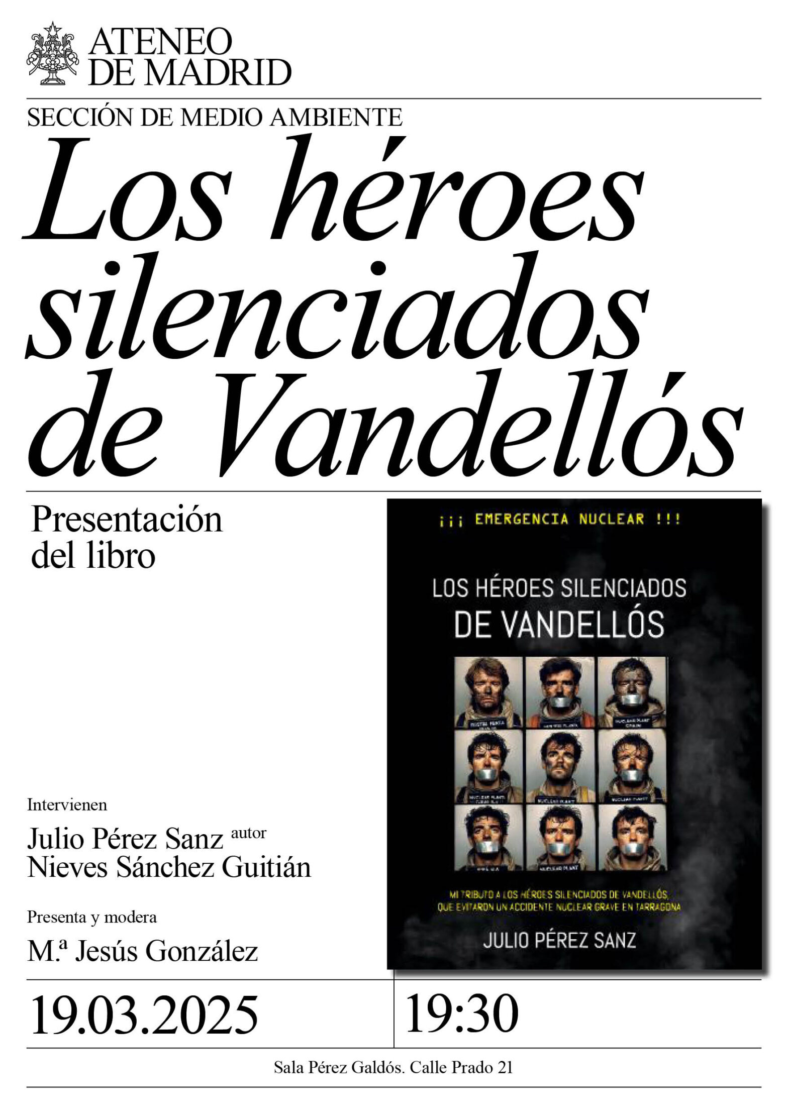 Sección de Medio Ambiente. Intervienen: Julio Pérez Sanz, autor, profesor encargado del Laboratorio de Tecnología Nuclear de la Escuela Técnica Superior de Ing. Industrial-UPM y Nieves Sánchez Guitián, presidenta de la Asociación profesional de Técnicos en Seguridad Nuclear). Presenta y modera M.ª Jesús González. Sala Pérez Galdós. 19:30h.
