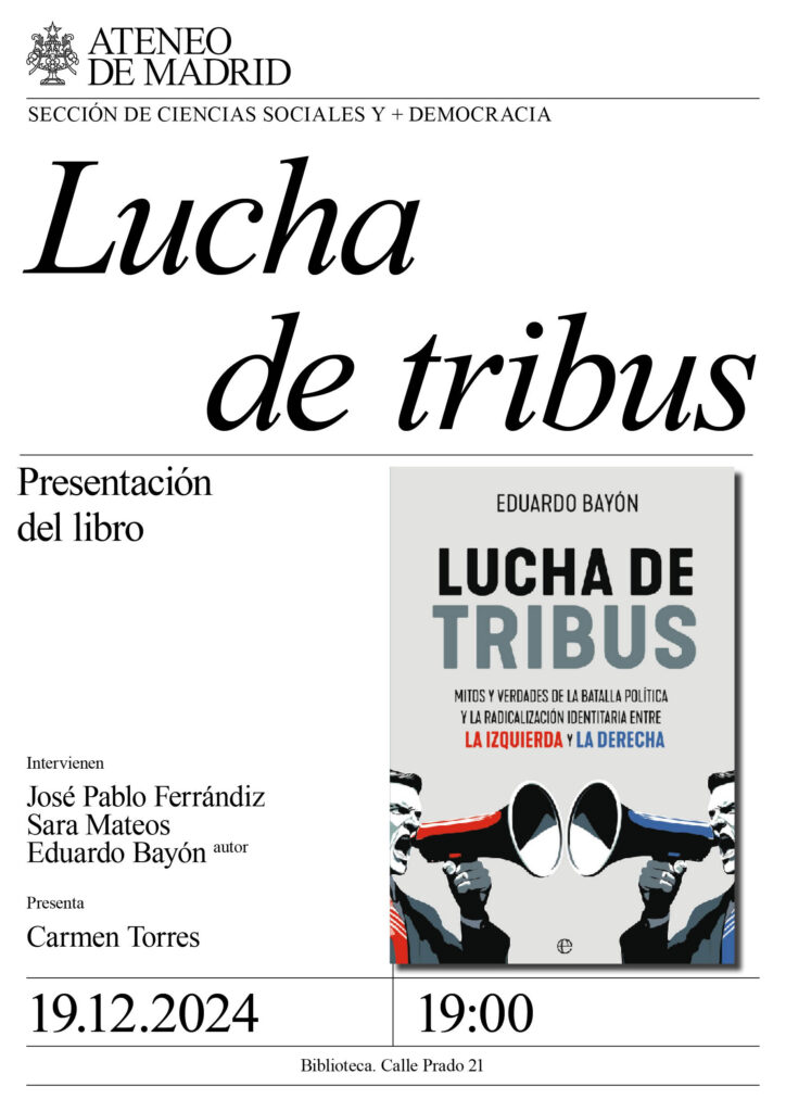 Sección de Ciencias Sociales. Intervienen: José Pablo Ferrándiz, sociólogo; Sara Mateos, politóloga; y Eduardo Bayón, autor. Presenta: Carmen Torres, profesora de comunicación política. Biblioteca. 19:00h.
