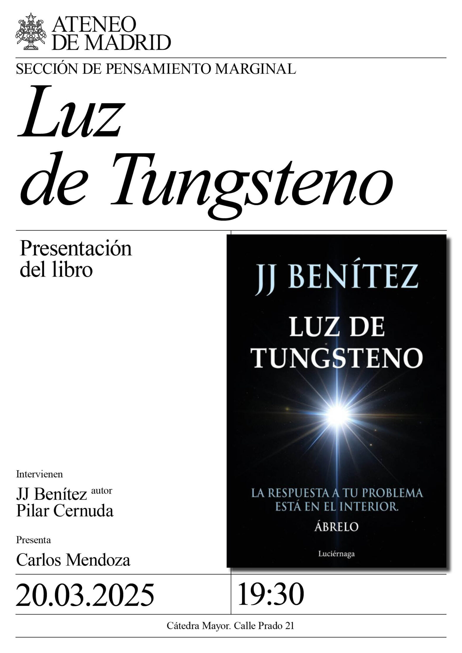 Sección de Pensamiento Marginal. Intervienen: JJ Benítez, autor y Pilar Cernuda. Presenta Carlos Mendoza. Cátedra Mayor. 19:30h.