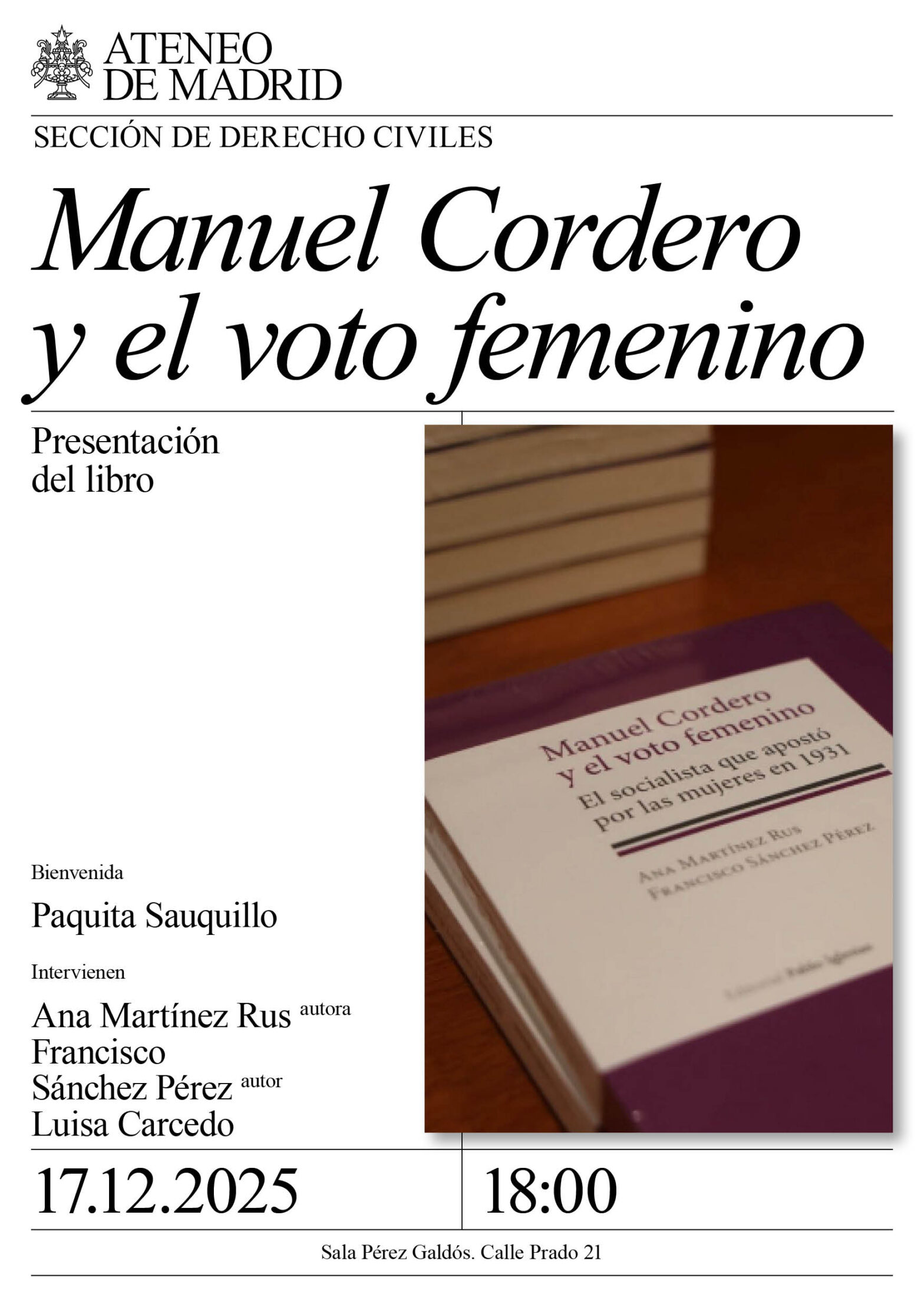 Sección de Derechos Civiles. Bienvenida: Paquita Sauquillo y Ana Martínez Rus, profesora de la UCM; Con los autores: Francisco Sánchez Pérez, profesor de la UC3M; y Luisa Carcedo. Sala Pérez Galdós. 18:00h.
