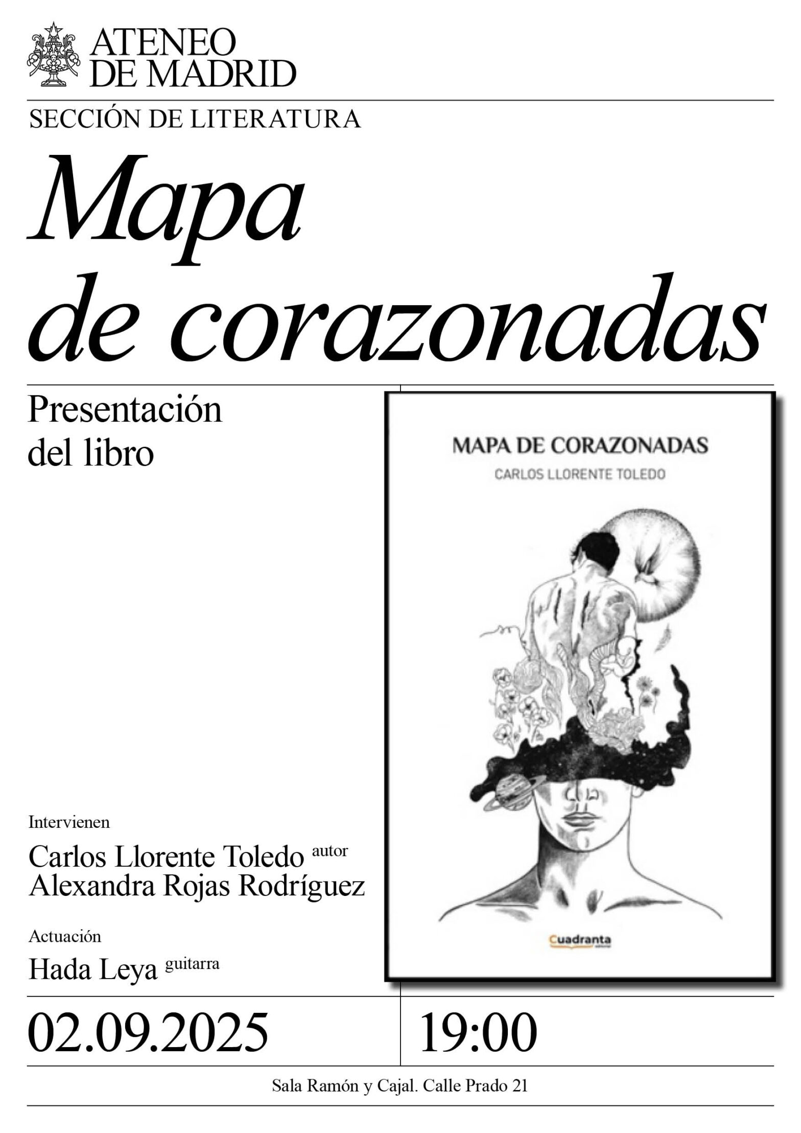 Sección de Literatura. Intervinienen: Carlos Llorente Toledo autor, poeta y actor y Alexandra Rojas Rodríguez, periodista, comunicadora, actriz de doblaje y sexóloga. Actuación: Hada Leya, guitarra. Sala Ramón y Cajal. 19:00h.