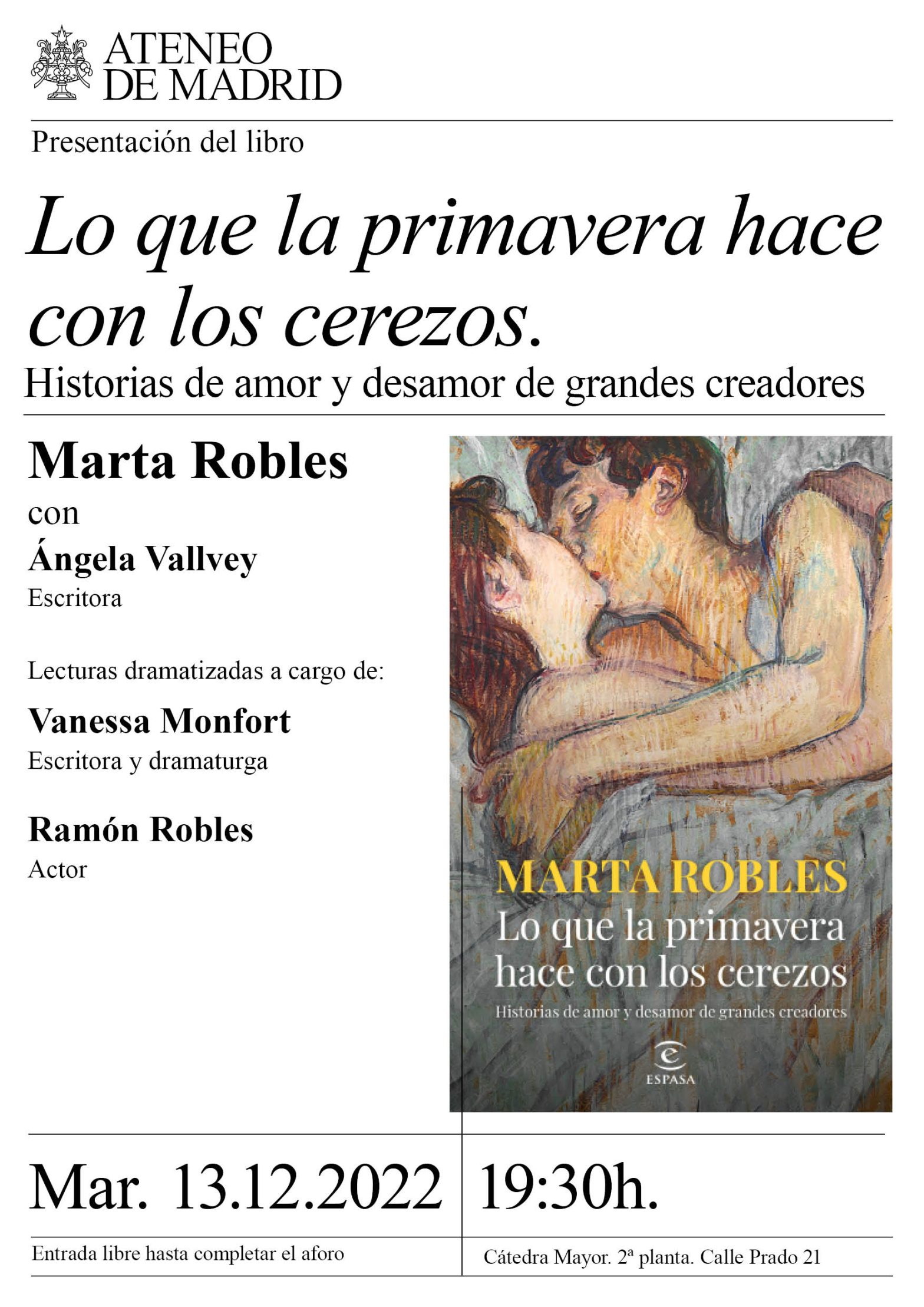 Presentación del libro Marta Robles. Lo que la primavera hace con los cerezos. Historias de amor y desamor de grandes creadores. Acompañarán a la autora Marta Robles: Ángela Vallvey, escritora. Lecturas dramatizadas a cargo de: Vanessa Monfort, escritora y dramaturga y Ramón Robles, actor. Cátedra Mayor. 19.30 h. Nota de prensa.