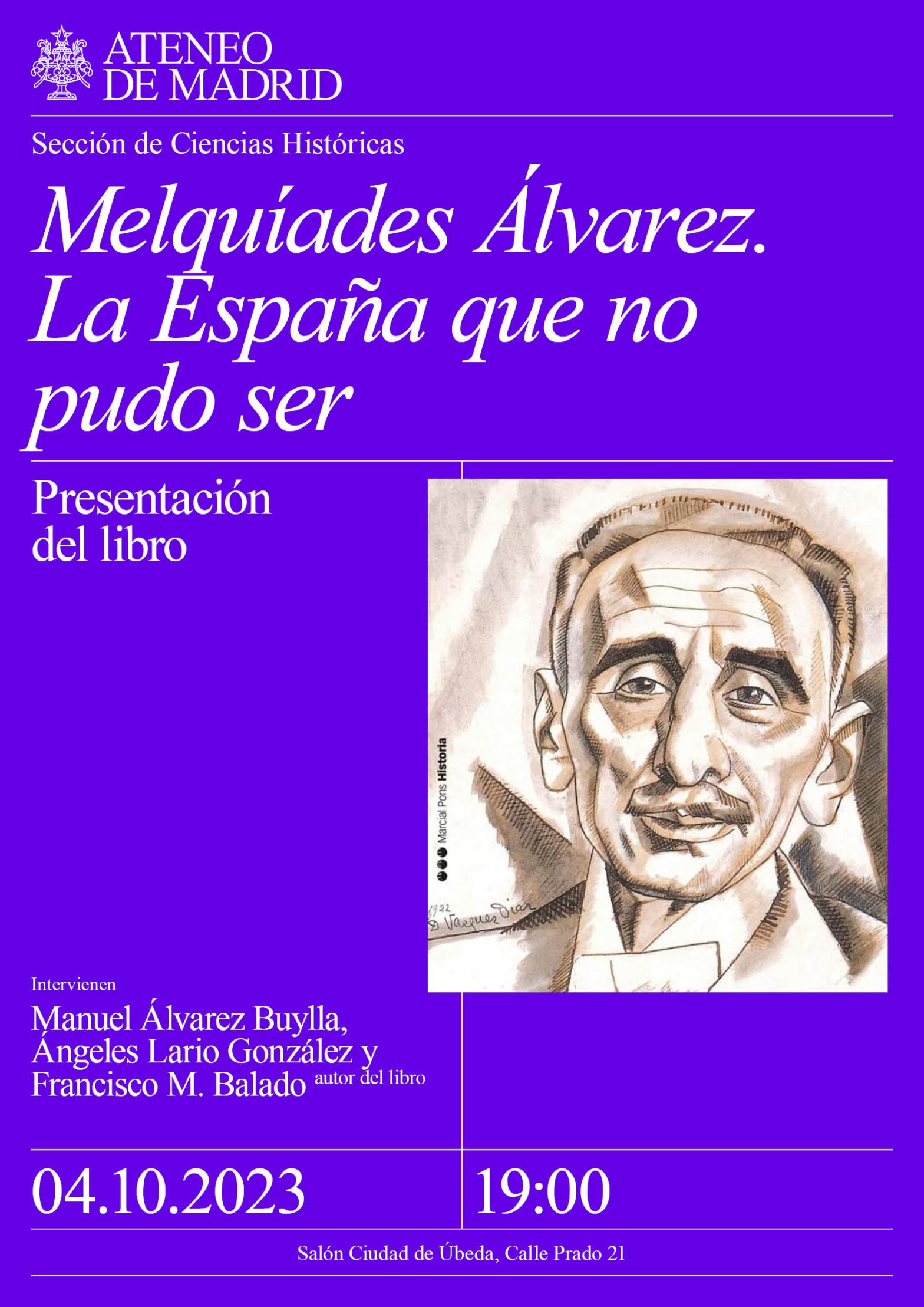Sección de Ciencias Históricas. Intervienen: Manuel Álvarez Buylla, procurador de los Tribunales y bisnieto de Melquíades Álvarez; Ángeles Lario González, catedrática de Historia Contemporánea UNED y el autor