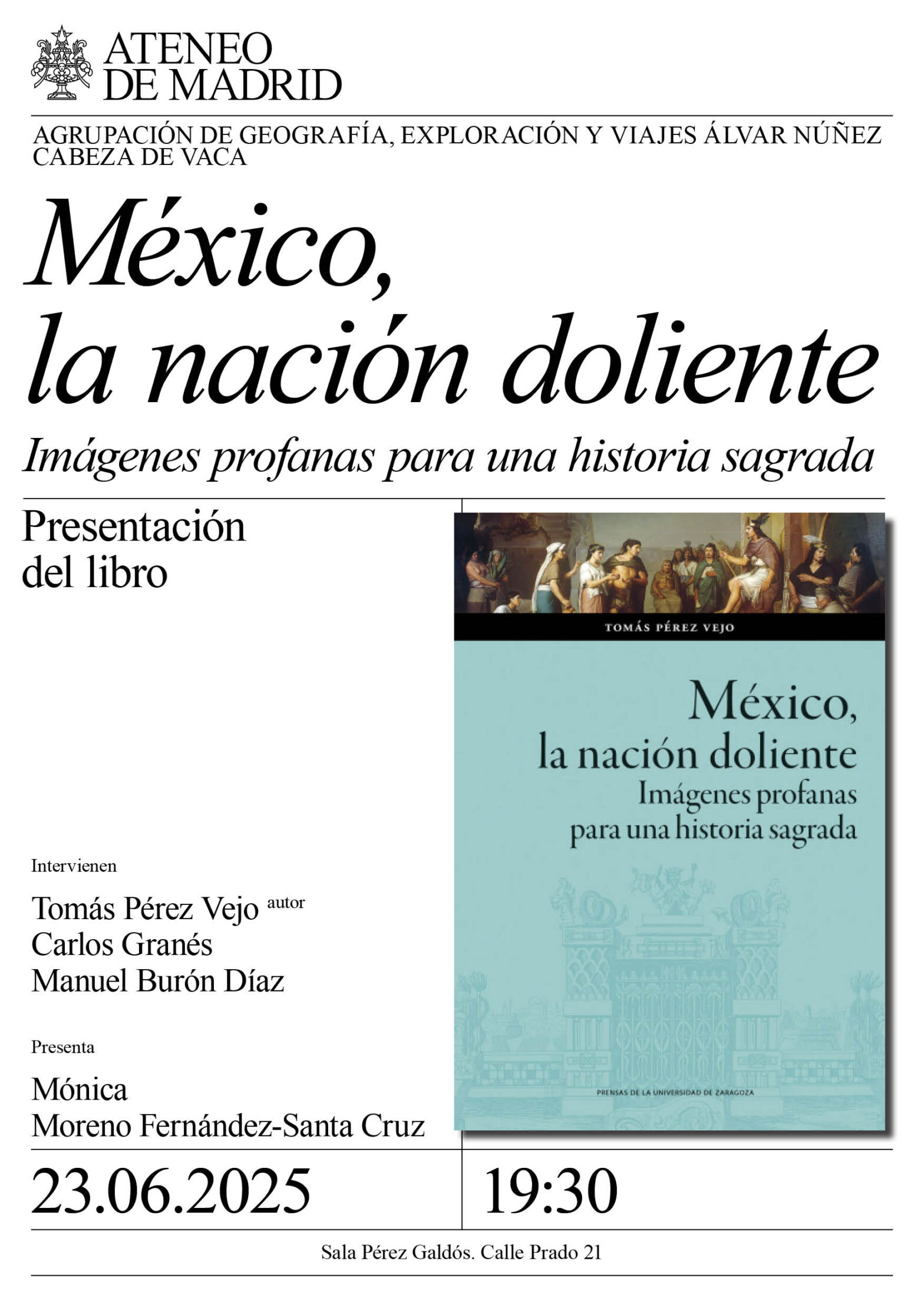Agrupación de geografía, exploración y viajes Álvar Núñez Cabeza de Vaca. Intervienen: Tomás Pérez Vejo, autor; Carlos Granés y Manuel Burón Díaz. Presenta Mónica Moreno Fernández-Santa Cruz. Sala Pérez Galdós. 19:30h.