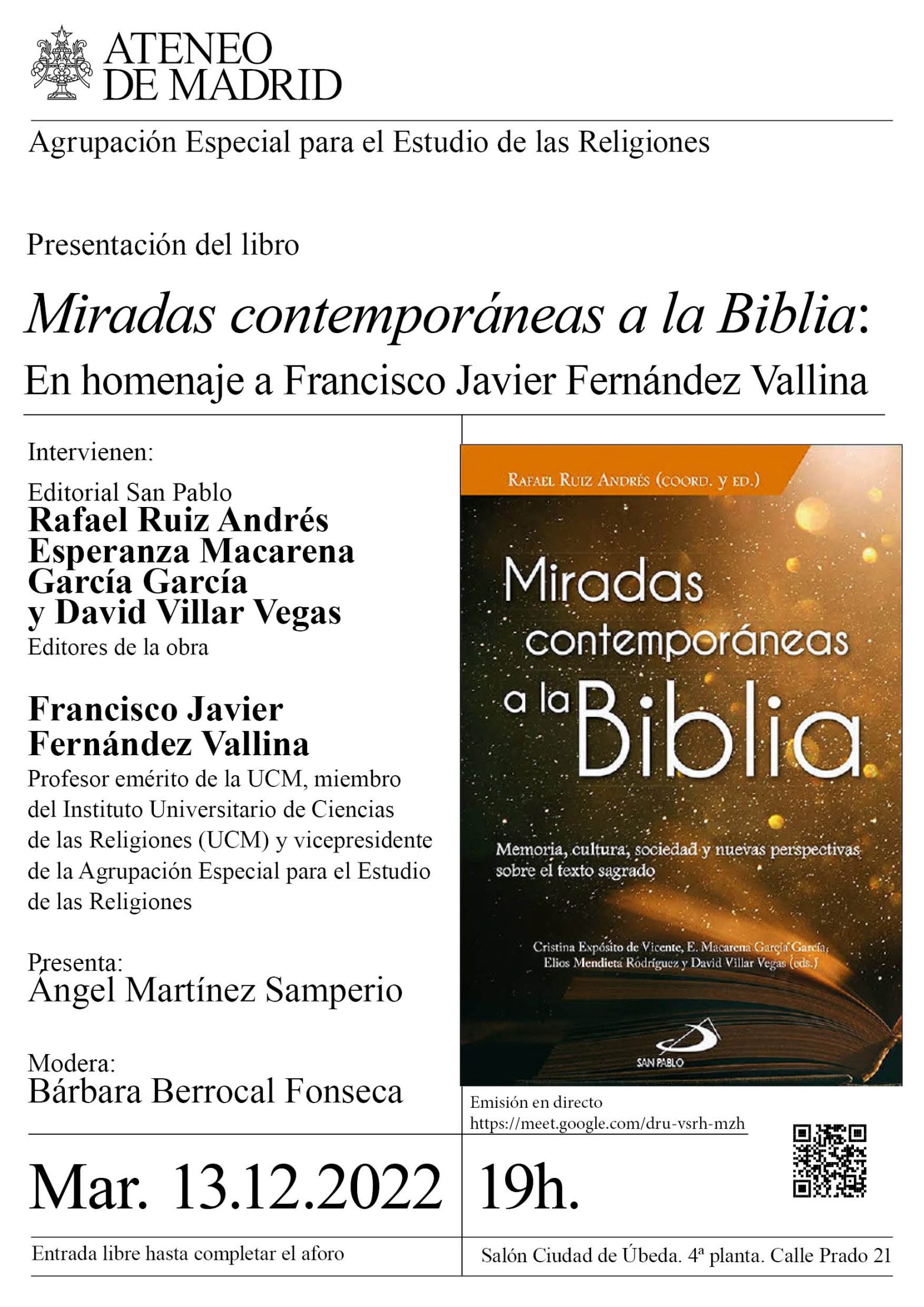 Agrupación Especial para el Estudio de las Religiones. Presentación del libro Miradas contemporáneas a la Biblia. Homenaje al profesor Francisco Javier Fernández Vallina. Intervienen: Editorial San Pablo, Rafael Ruiz Andrés, Esperanza Macarena García García y David Villar Vegas, editores de la obra, Francisco Javier Fernández Vallina, profesor emérito de la Universidad Complutense de Madrid, miembro del Instituto Universitario de Ciencias de las Religiones (UCM). Presenta: Ángel Martínez Samperio. Modera: Bárbara Berrocal Fonseca. Salón Ciudad de Úbeda. 19 h.