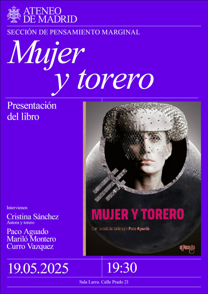 Sección de Pensamiento Marginal. Intervienen: Cristina Sánchez, autora y torero; Paco Aguado, periodista; Mariló Montero y Curro Váquez. Sala Larra. 19:30h.