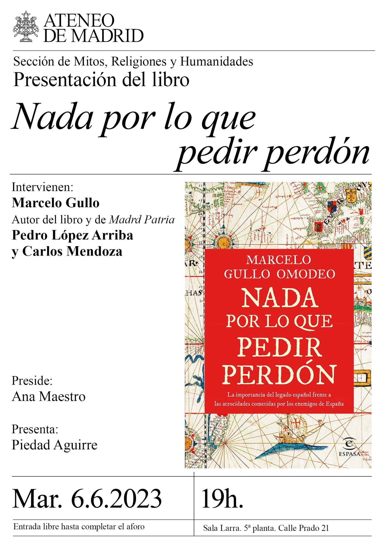 Sección de Mitos, Religiones y Humanidades. Intervienen: Marcelo Gullo, autor del libro y de Madrd Patria; Pedro López Arriba y Carlos Mendoza. Preside: Ana Maestro. Presenta: Piedad Aguirre. Sala Larra. 19h.