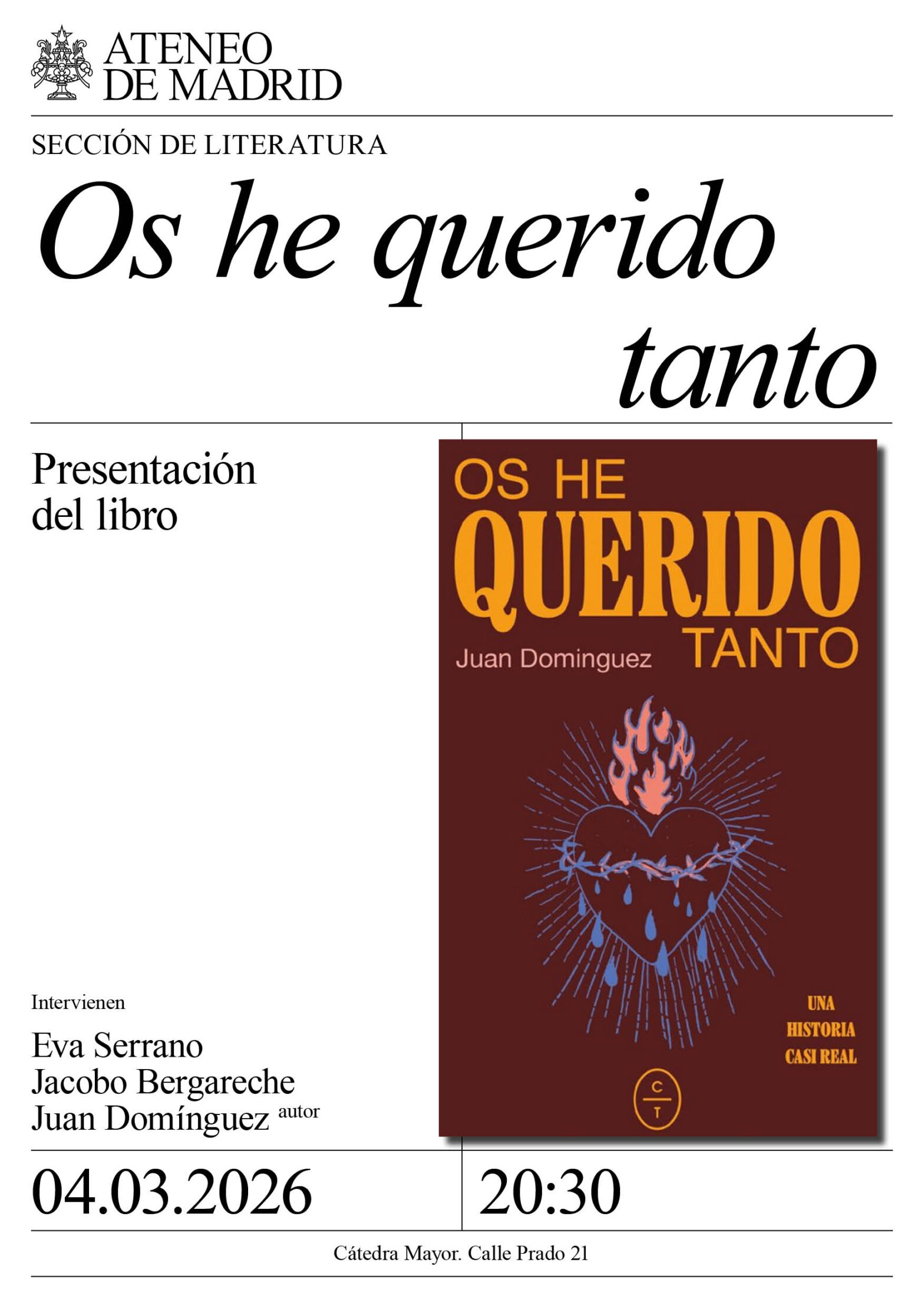 Sección de Literatura. Intervienen: Eva Serrano, editora de círculo de Tiza; Jacobo bergareche, escritor; y Juan Domínguez, autor. Cátedra Mayor. 20:30h.